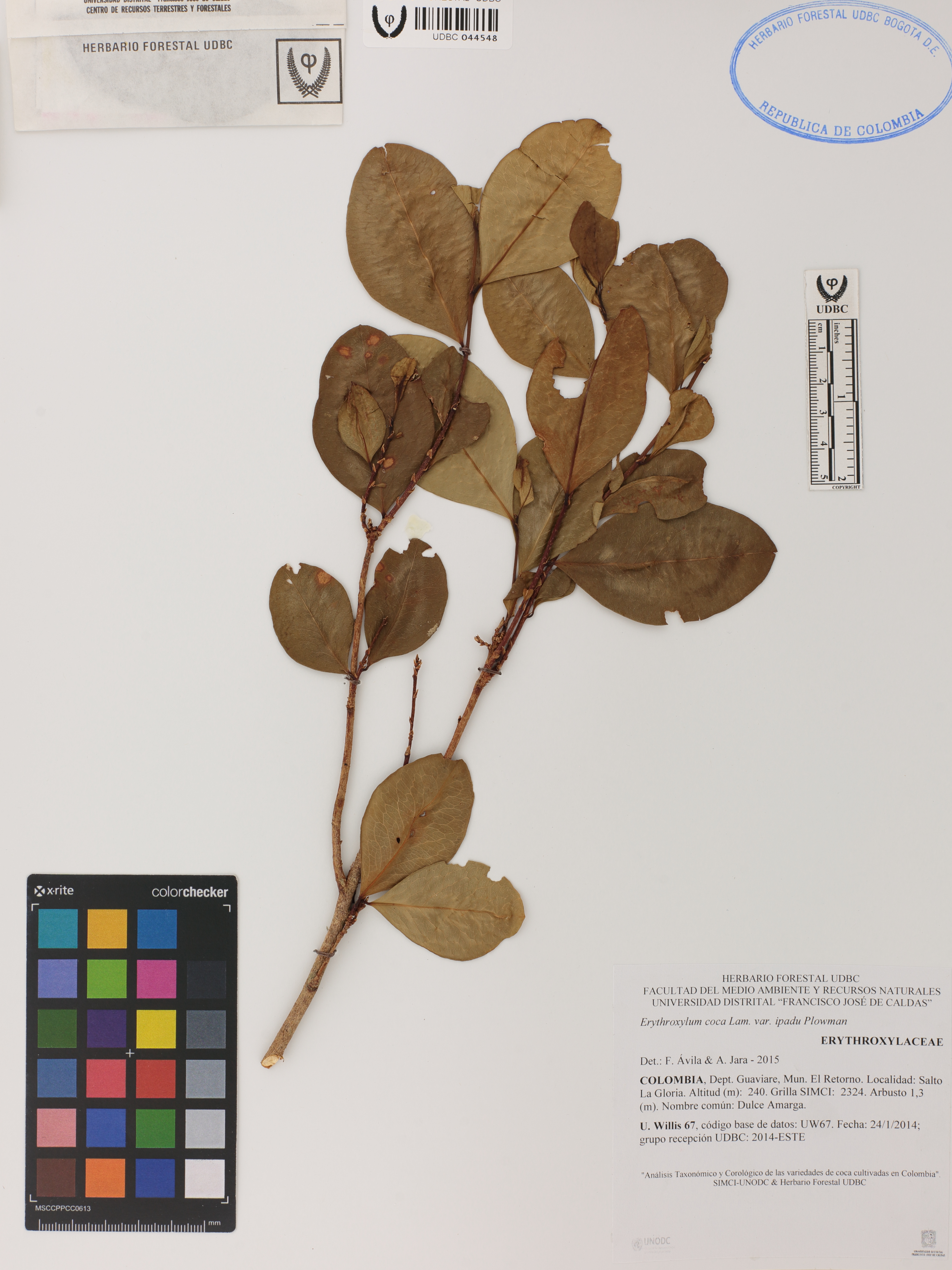 Fotografía del ejemplar Willis, U. 67, determinado como Erythroxylum coca var. ipadu en el año 2015
