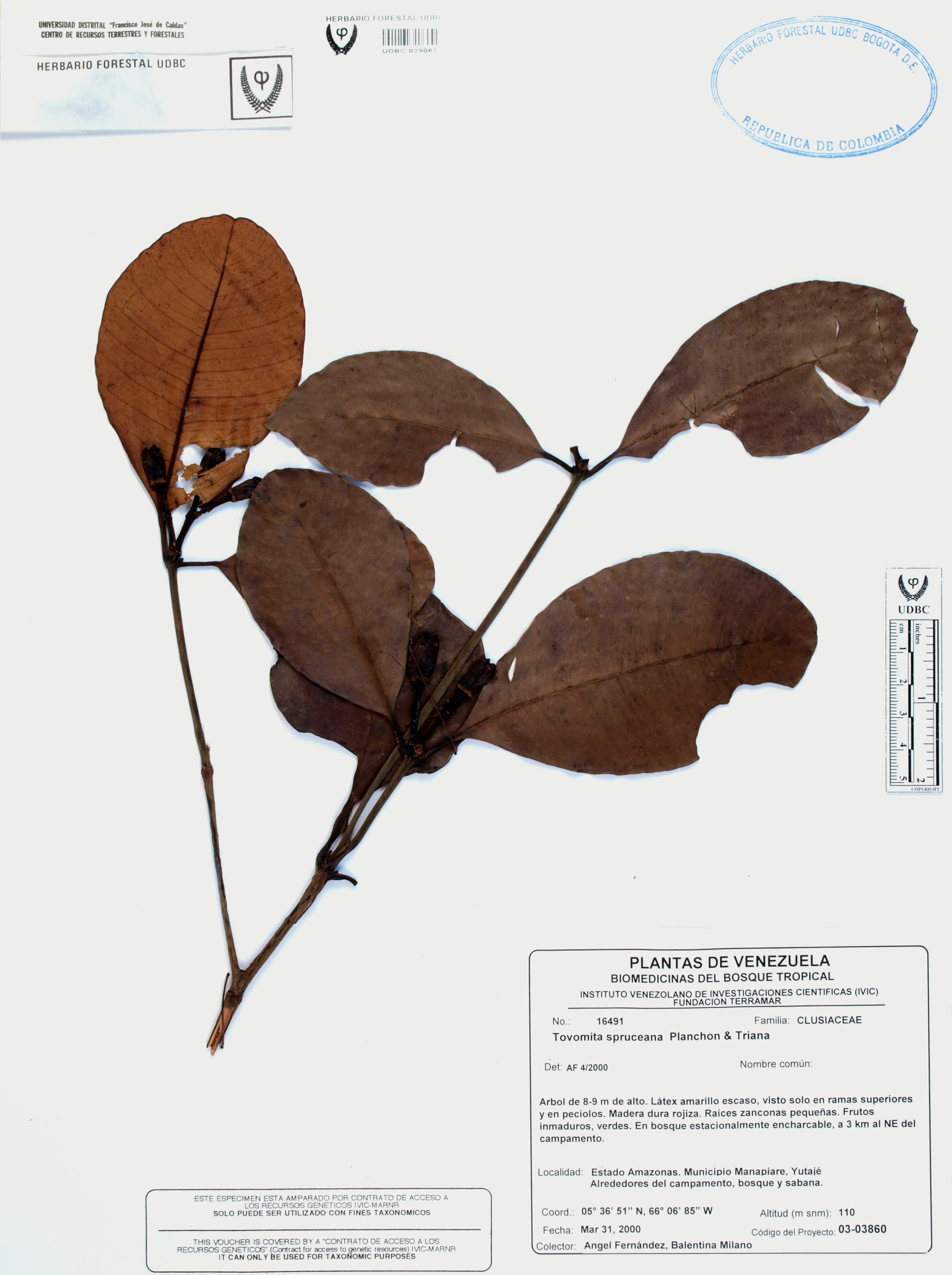 | dc.description | Fotografía del ejemplar Fernández, A. 16491, determinado como Tovomita spruceana en el año 2000 | |