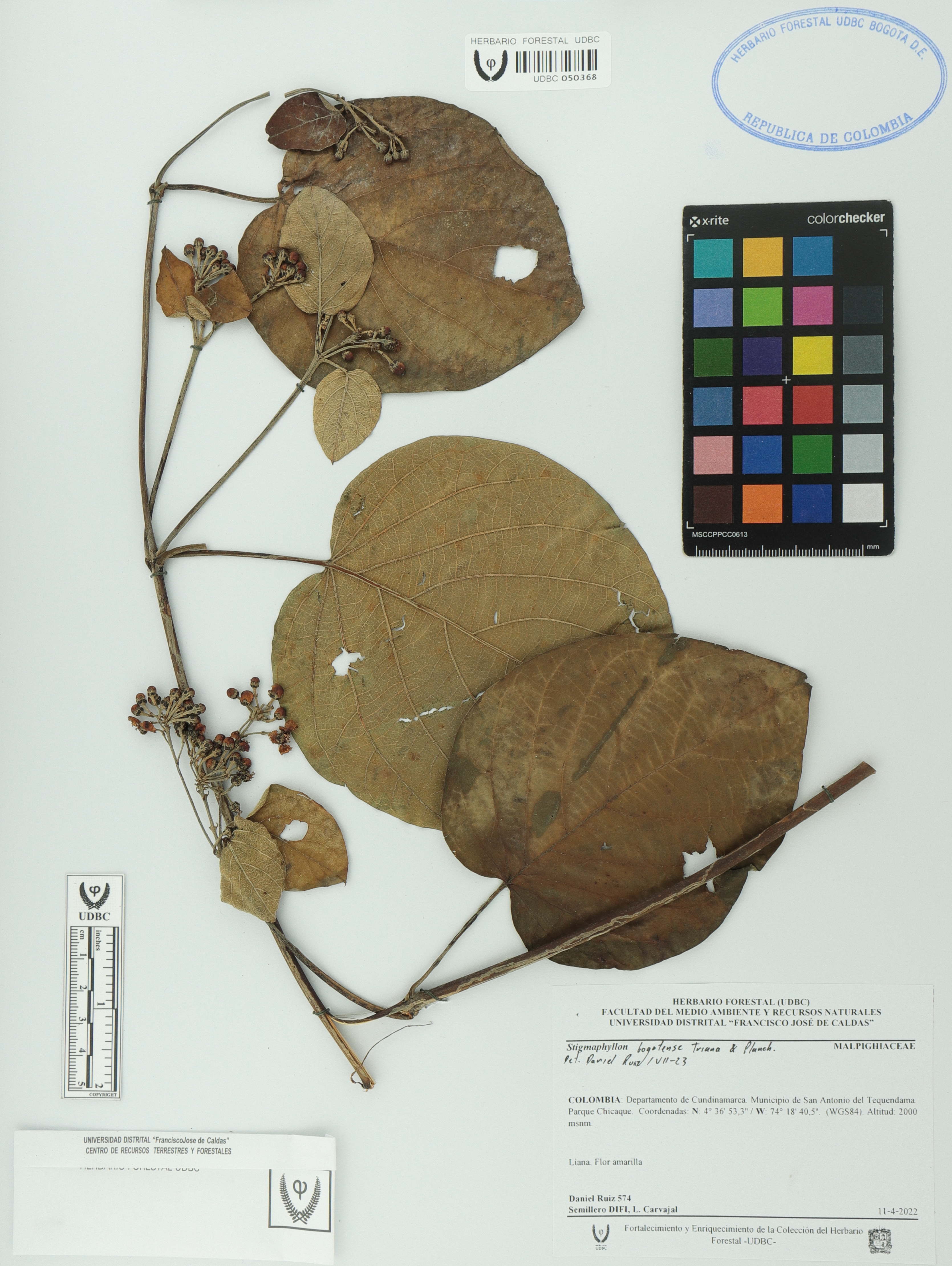 | dc.description | Fotografía del ejemplar Ruiz, D. 574, determinado como Stigmaphyllon bogotense en el año 2023 | |