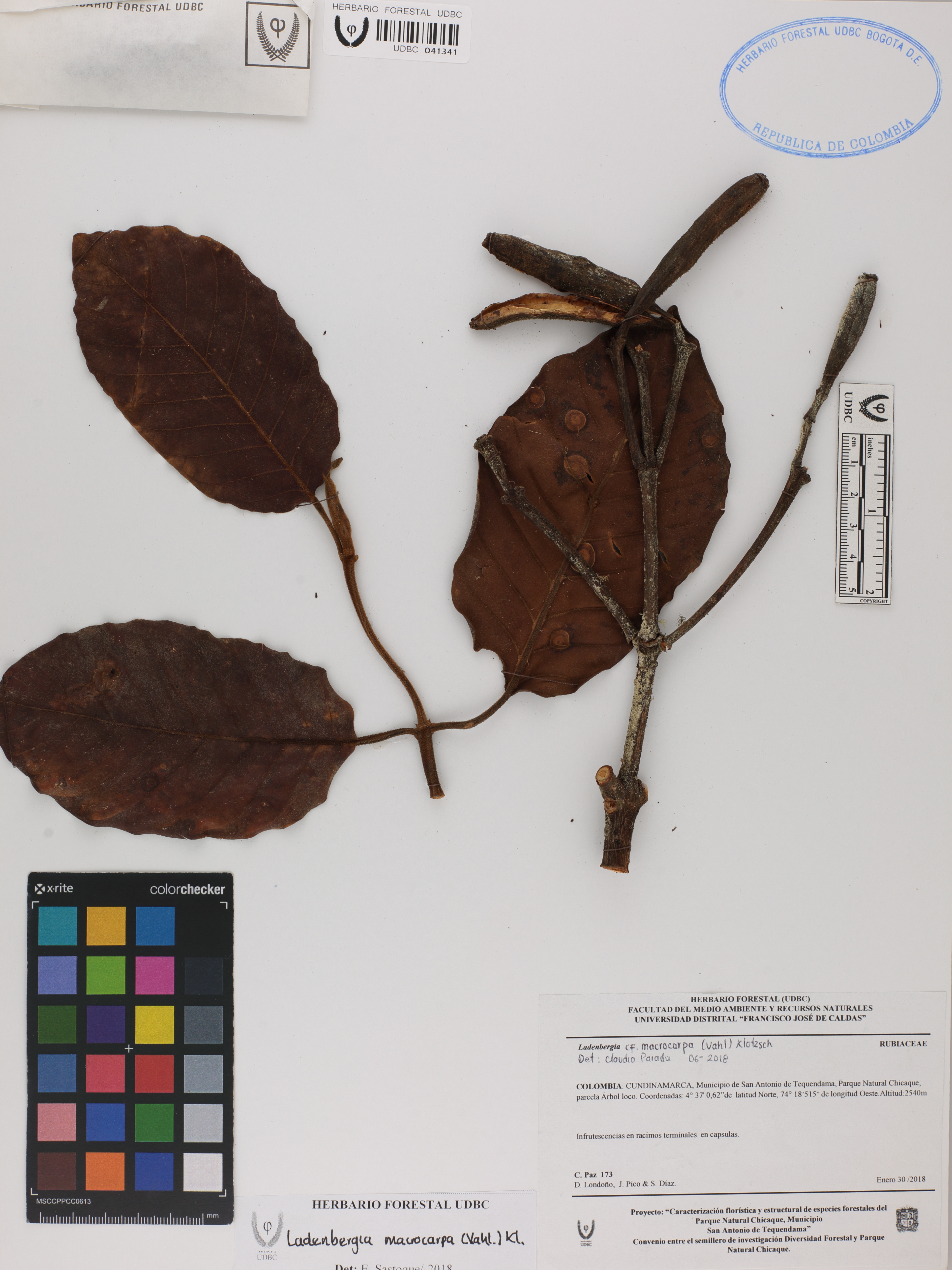 Fotografía del ejemplar Paz, C. 173, determinado como Ladenbergia macrocarpa en el año 2018