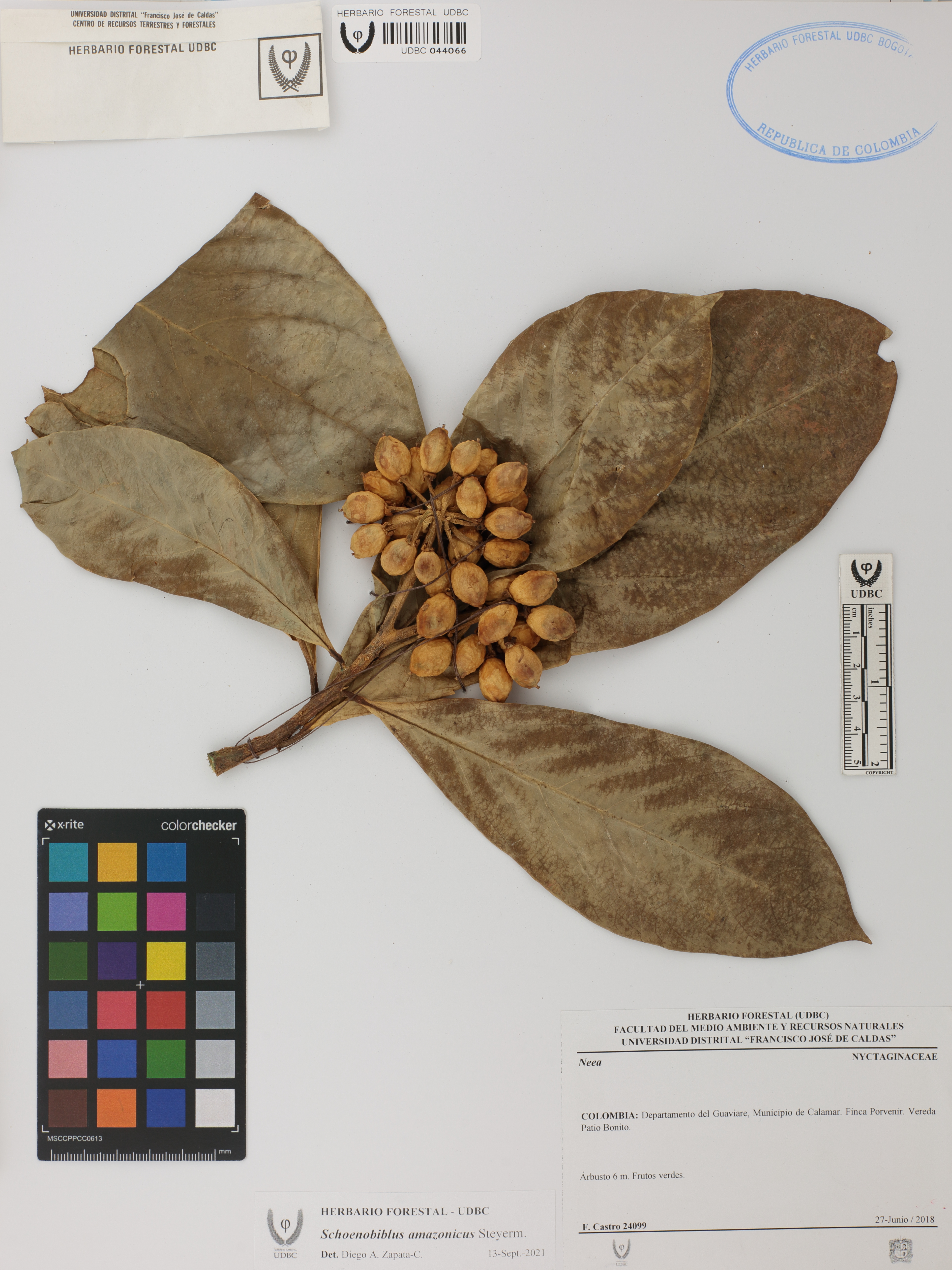 Fotografía del ejemplar Castro, F. 24099, determinado como Schoenobiblus amazonicus en el año 2021