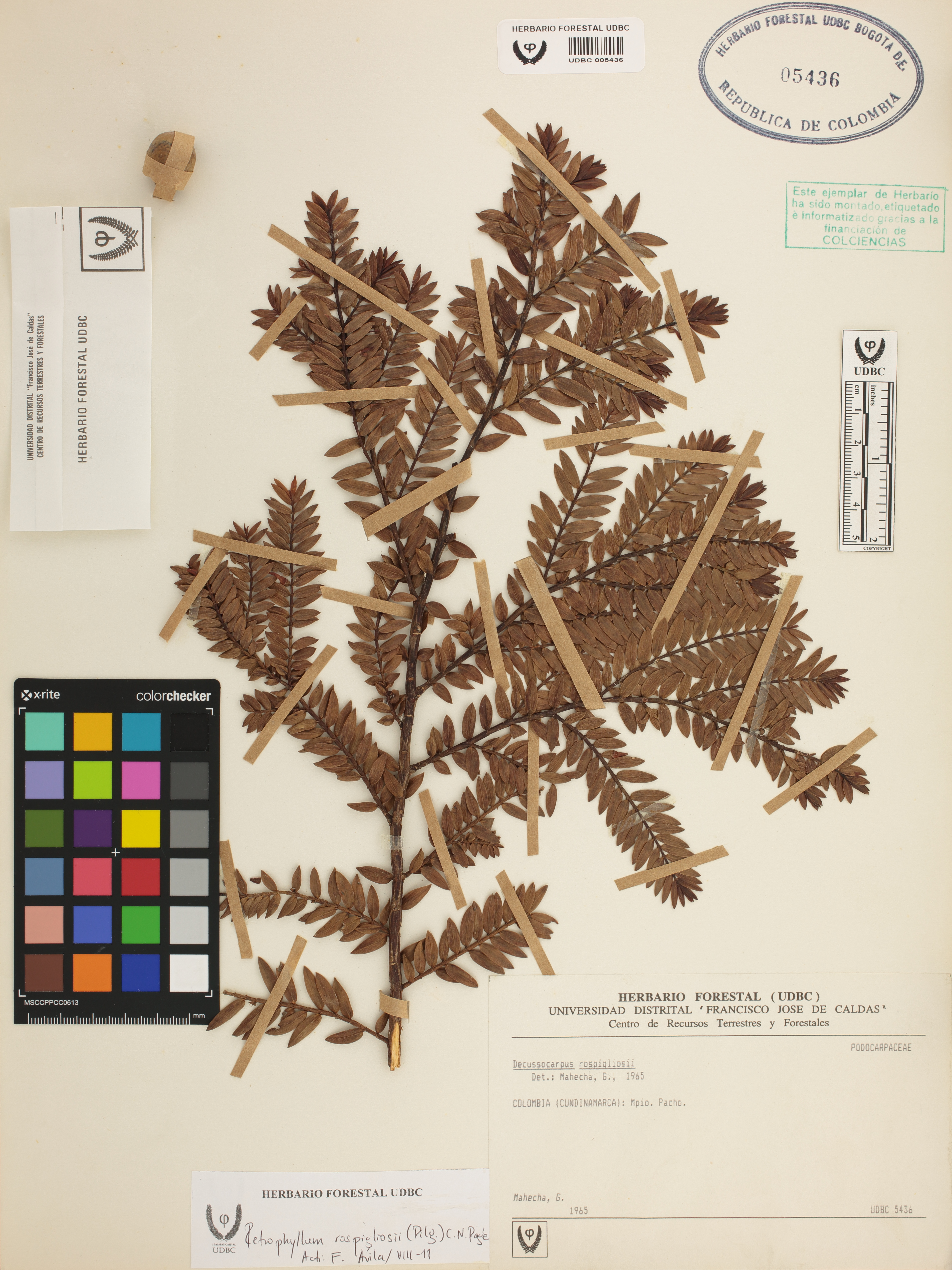 Fotografía del ejemplar Mahecha, G., determinado como Retrophyllum rospigliosii en el año 2011
