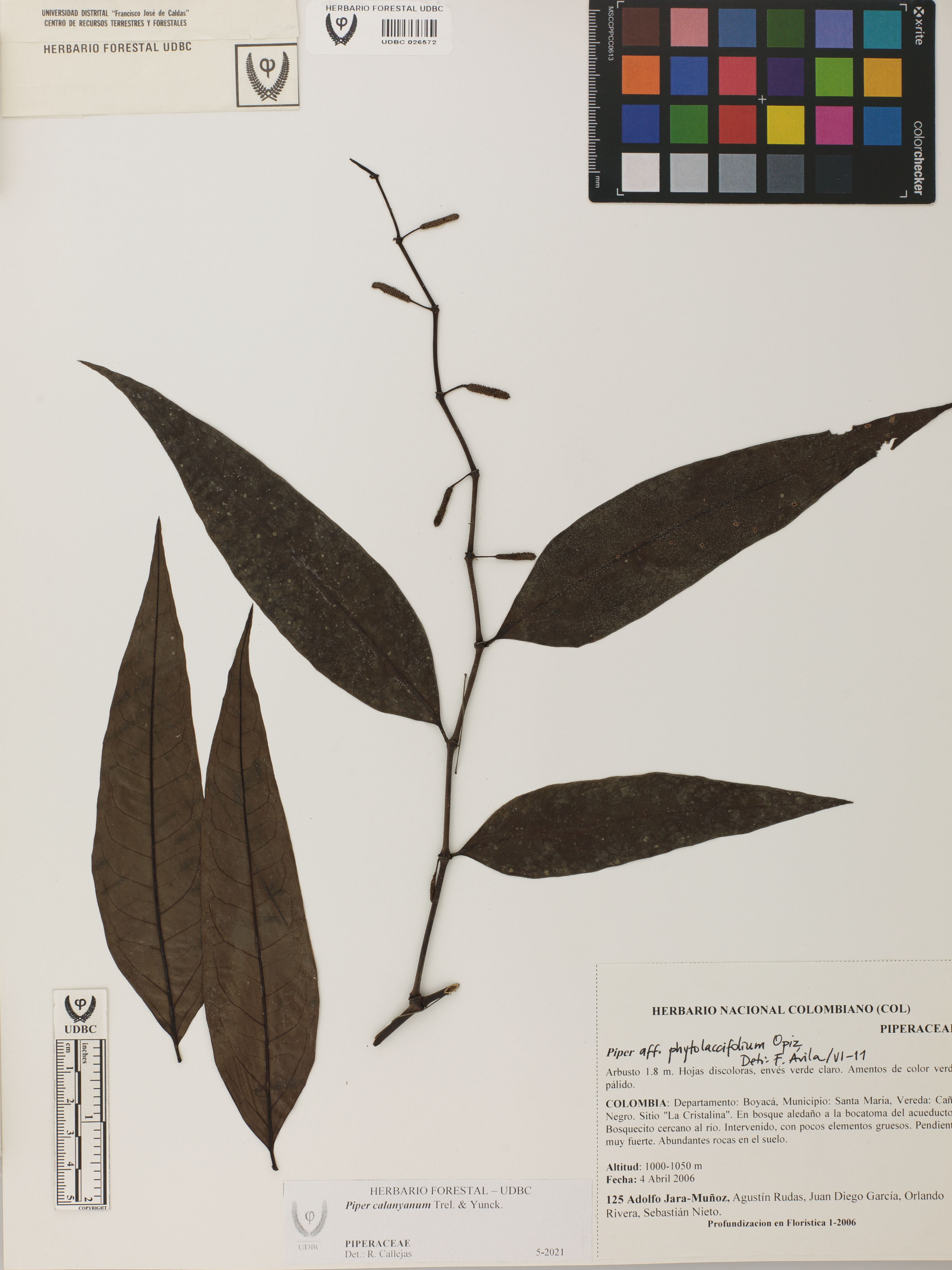Fotografía del ejemplar Jara-Muñoz, A. 125, determinado como Piper calanyanum en el año 2021