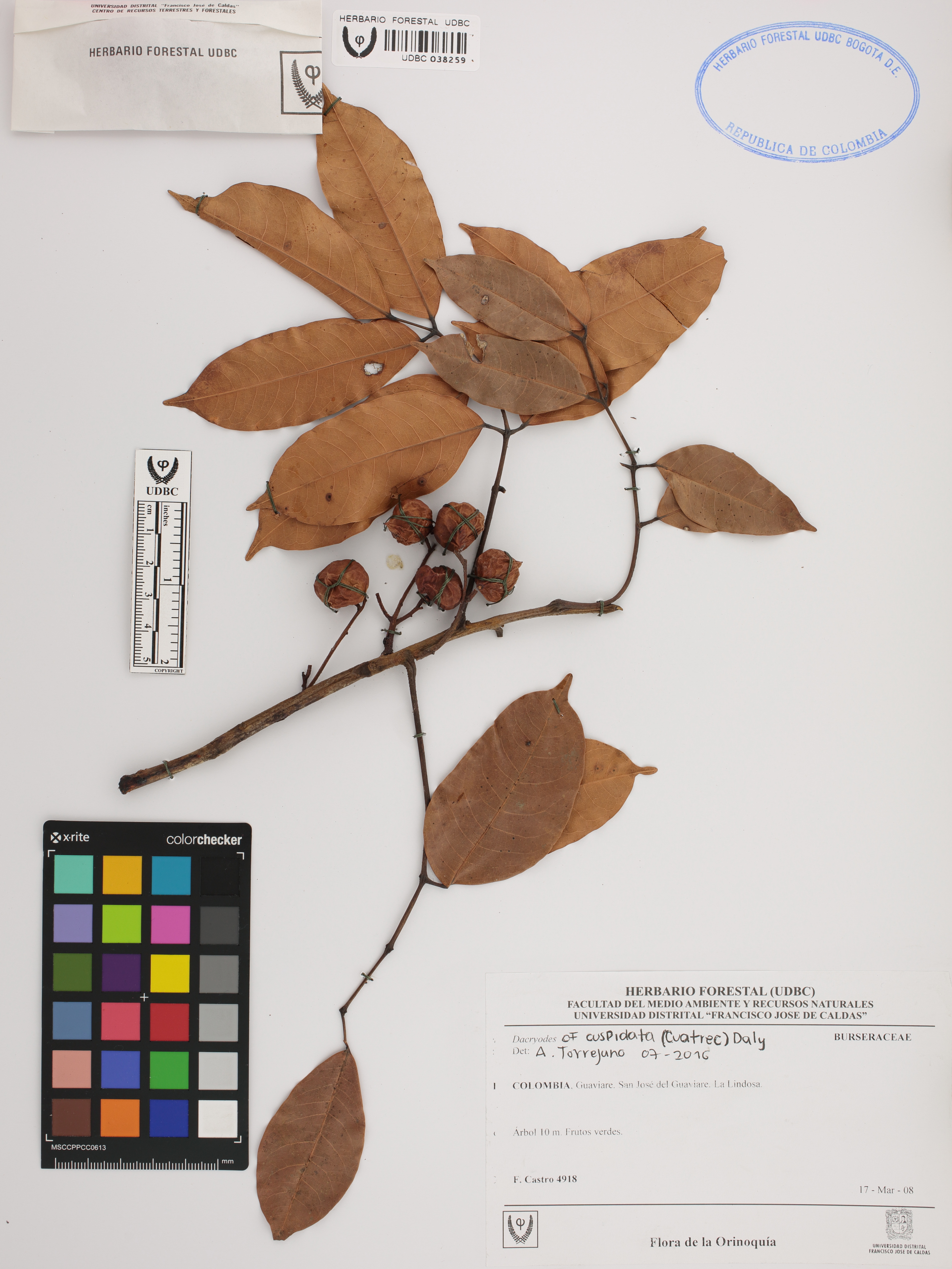Fotografía del ejemplar Castro, F. 4918, determinado como Dacryodes cuspidata en el año 2016