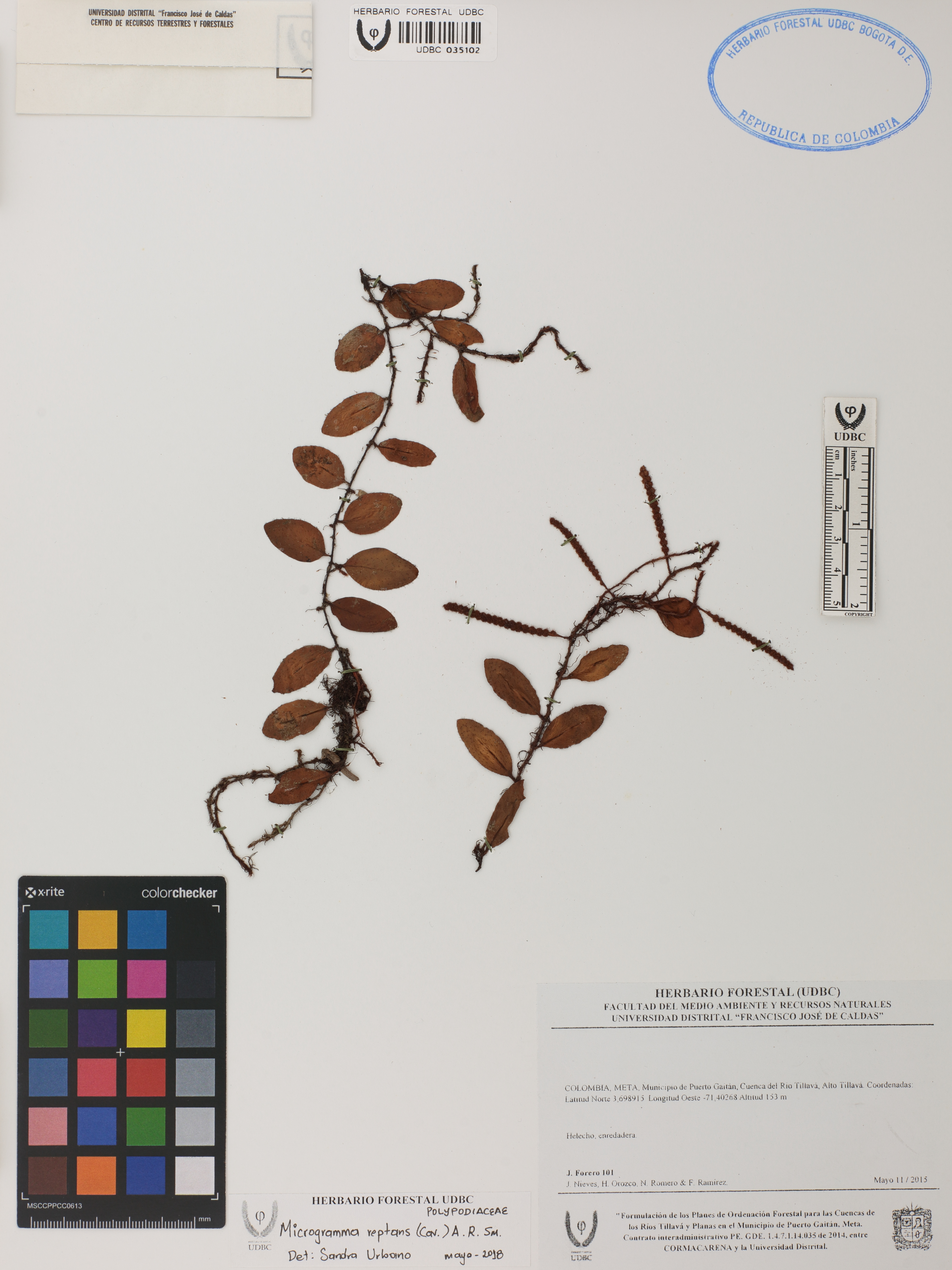 Fotografía del ejemplar Forero, J. 101, determinado como Microgramma reptans en el año 2018