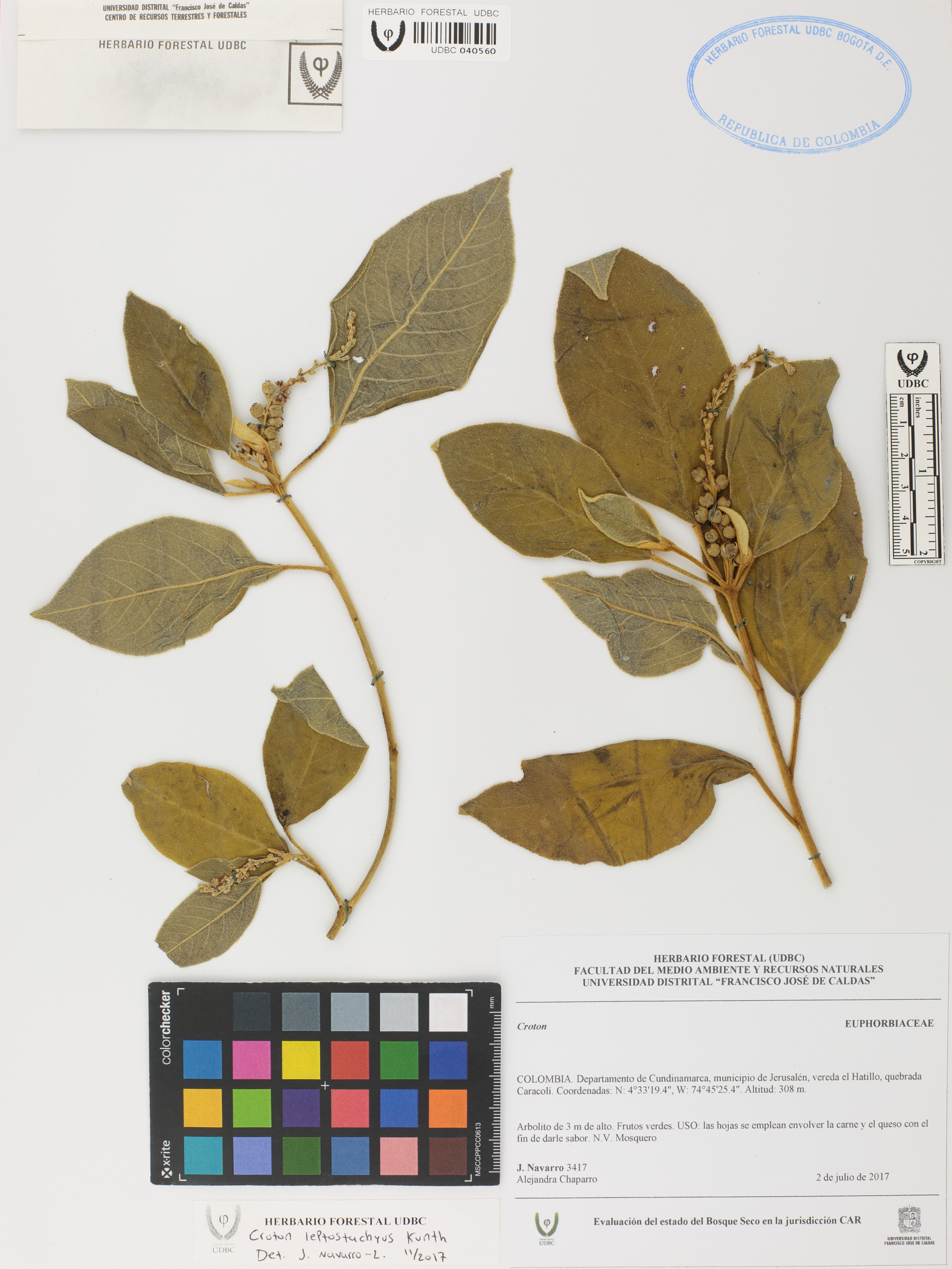 | dc.description | Fotografía del ejemplar Navarro, J. 3417, determinado como Croton leptostachyus en el año 2017 | |