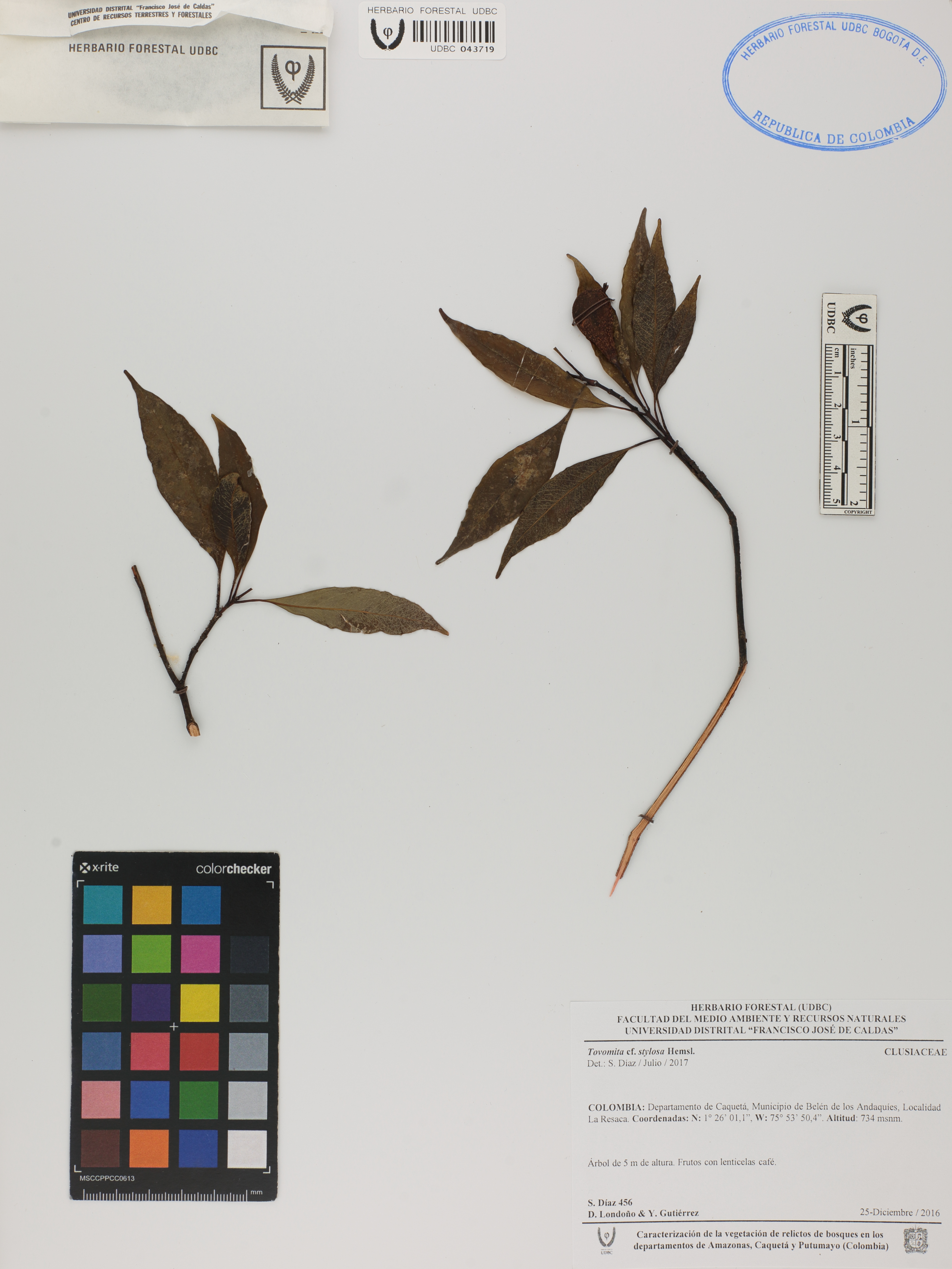 Fotografía del ejemplar Díaz, S. 456, determinado como Tovomita stylosa en el año 2017