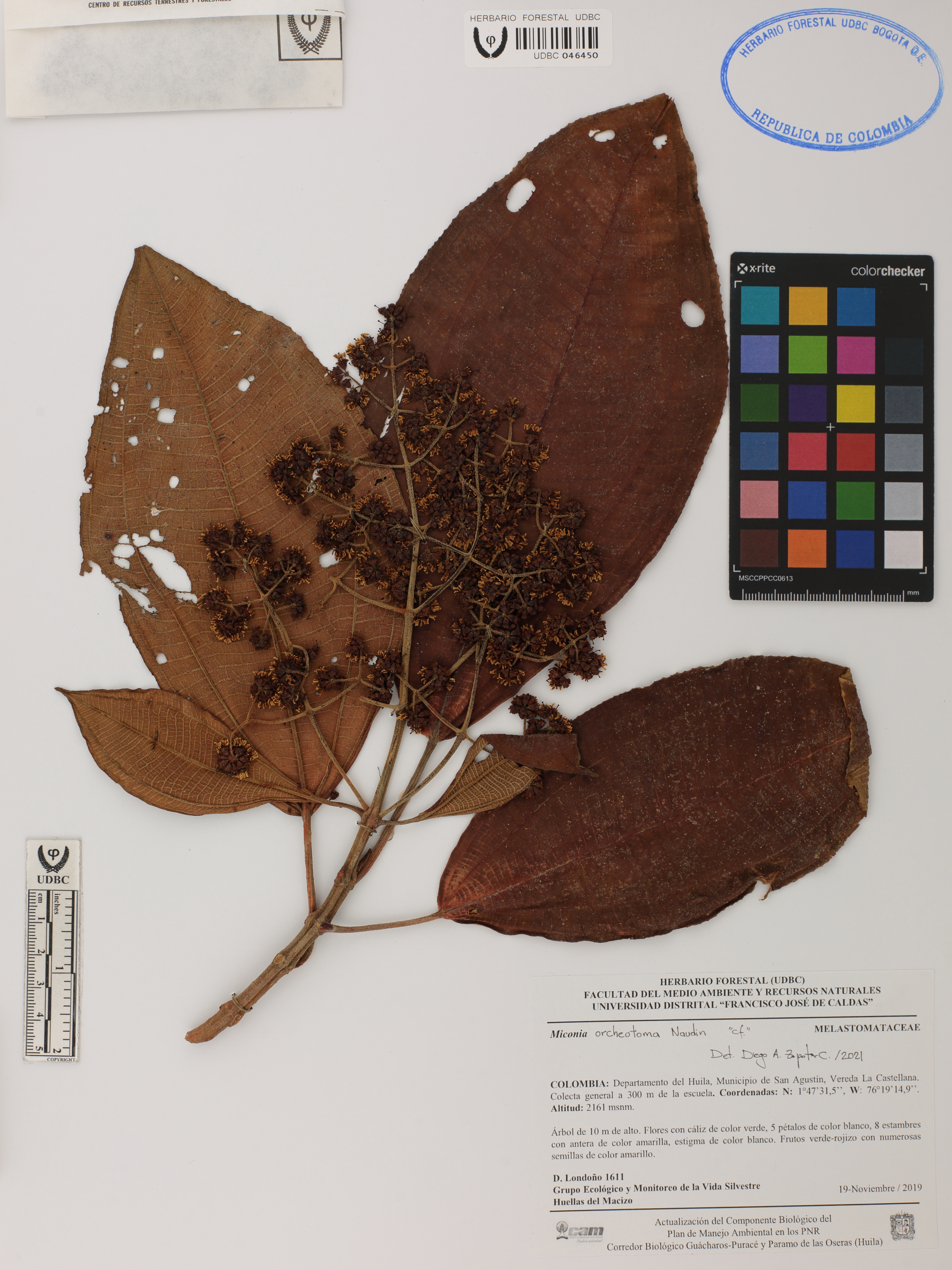 Fotografía del ejemplar Londoño, D. 1611, determinado como Miconia orcheotoma en el año 2021