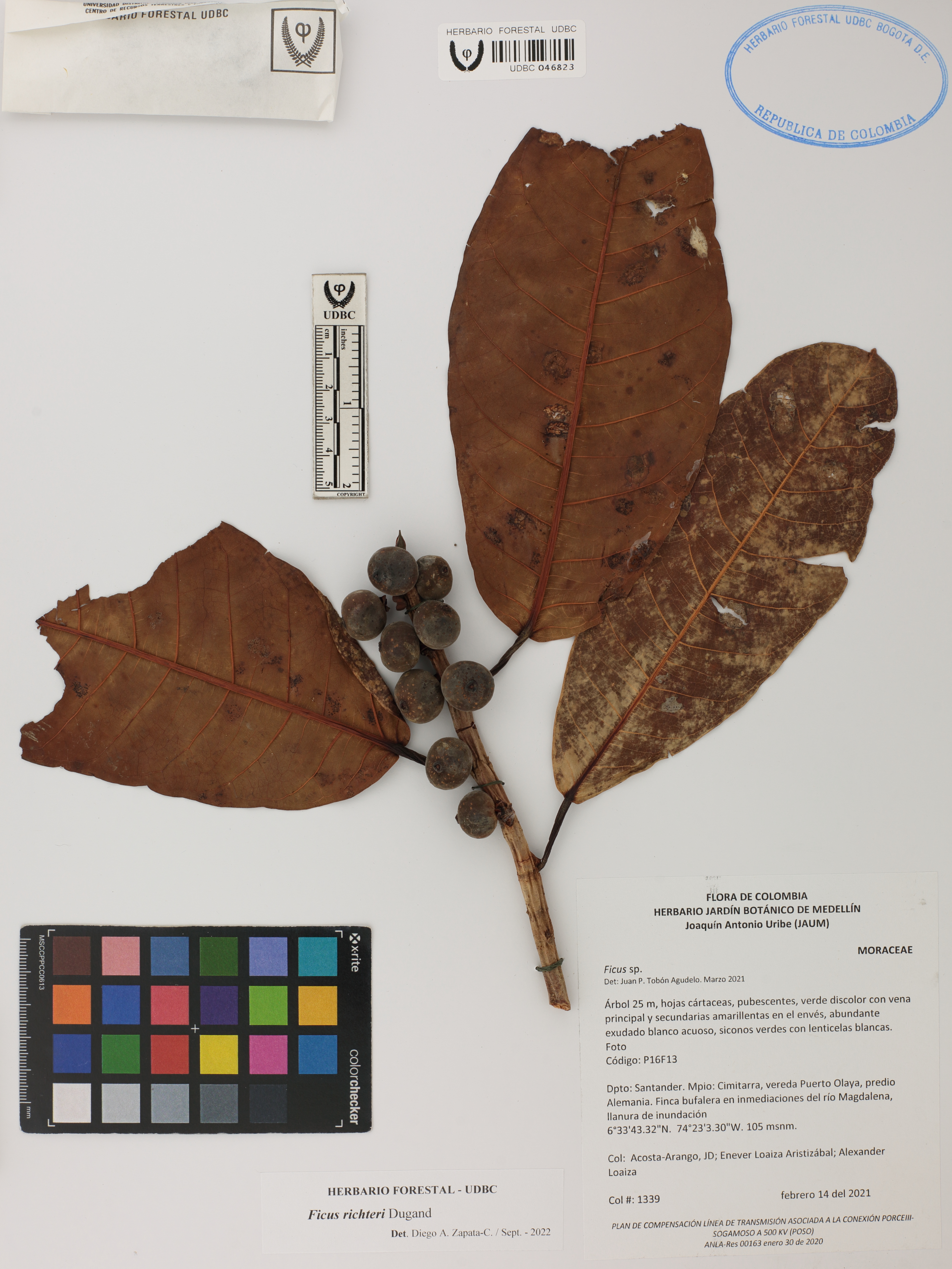 Fotografía del ejemplar Acosta-Arango, J. 1339, determinado como Ficus richteri en el año 2022