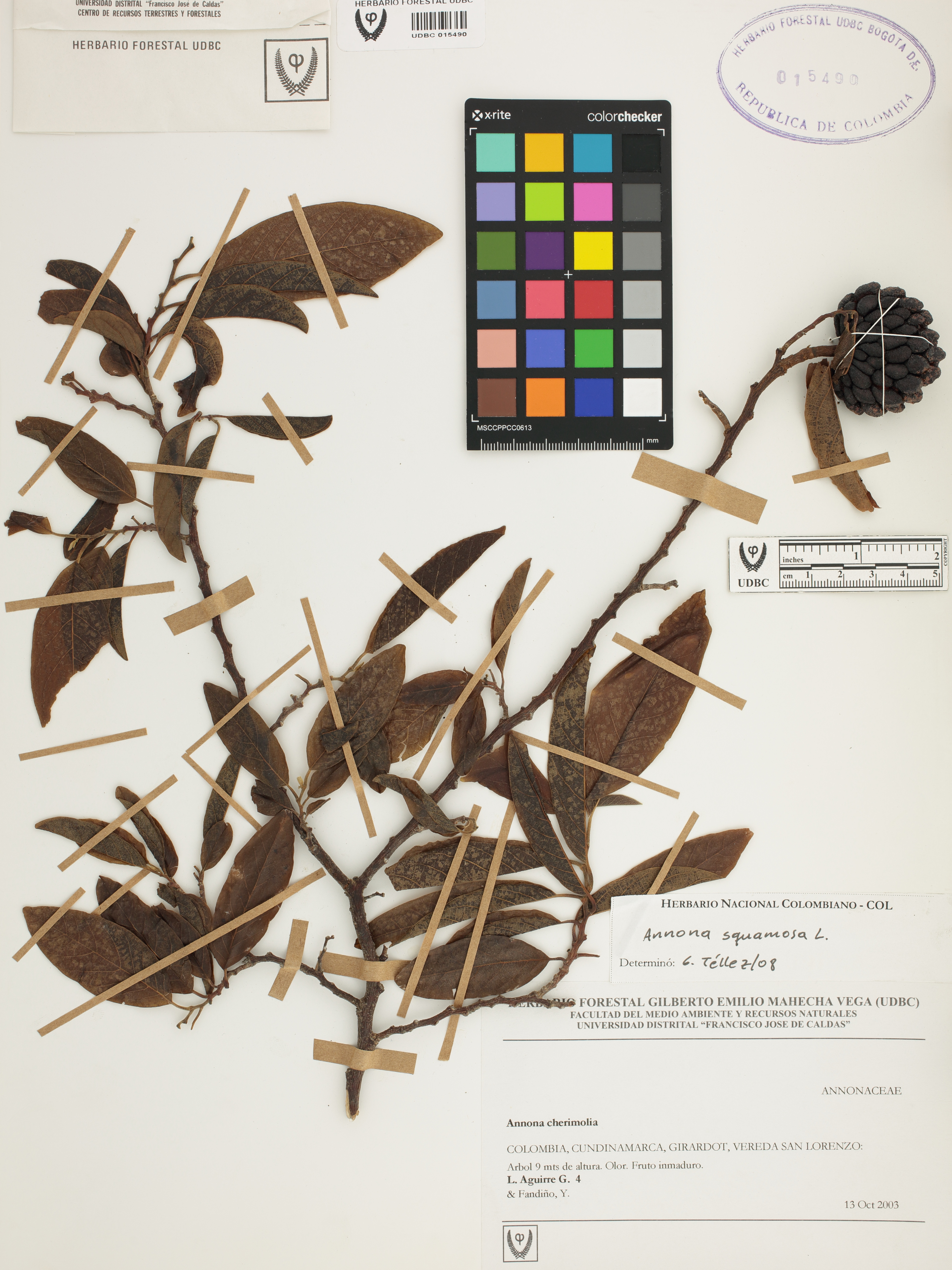 Fotografía del ejemplar Aguirre, L. 4, determinado como Annona squamosa en el año 2008