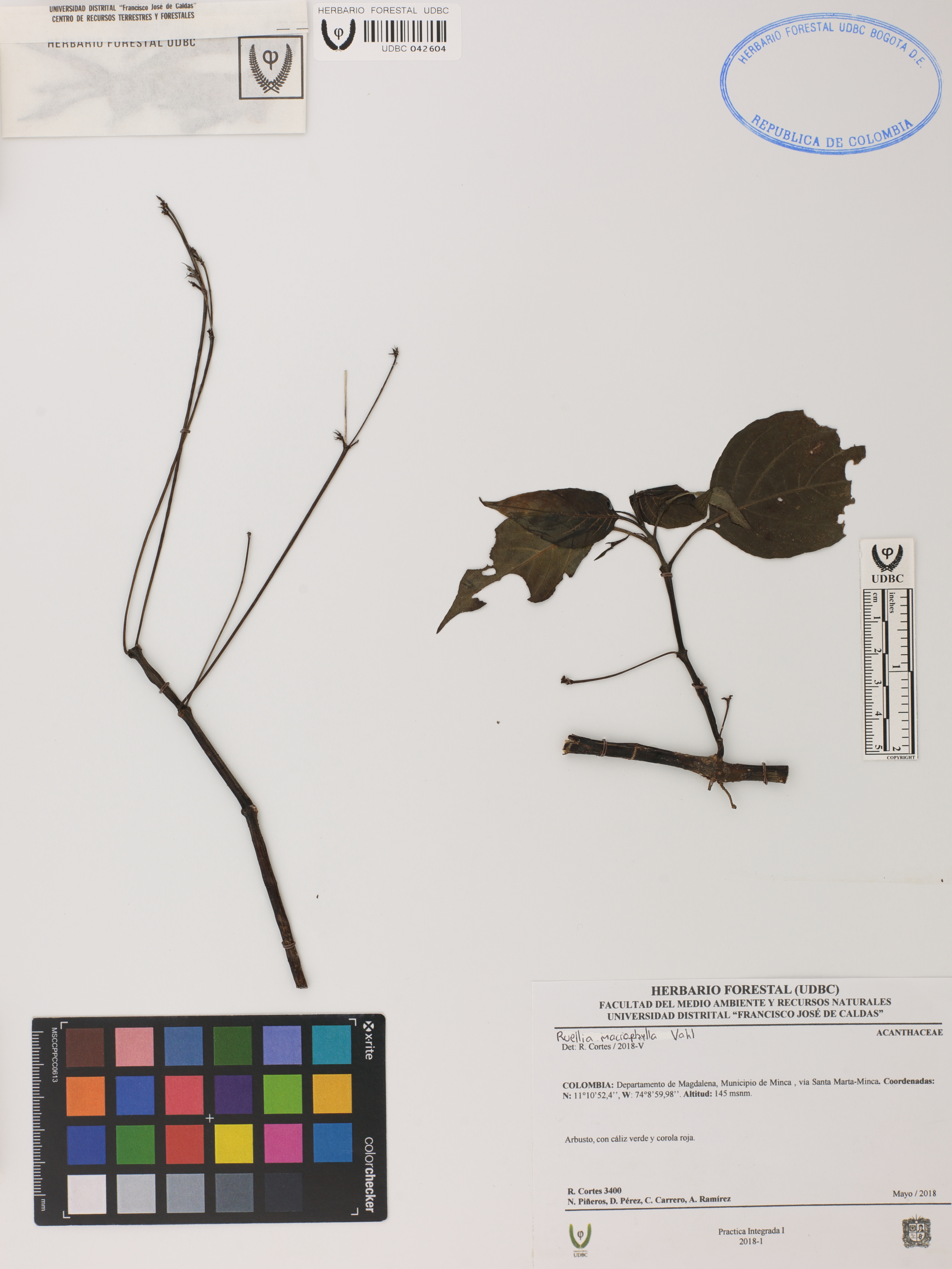 Fotografía del ejemplar Cortés, R. 3400, determinado como Ruellia macrophylla en el año 2018