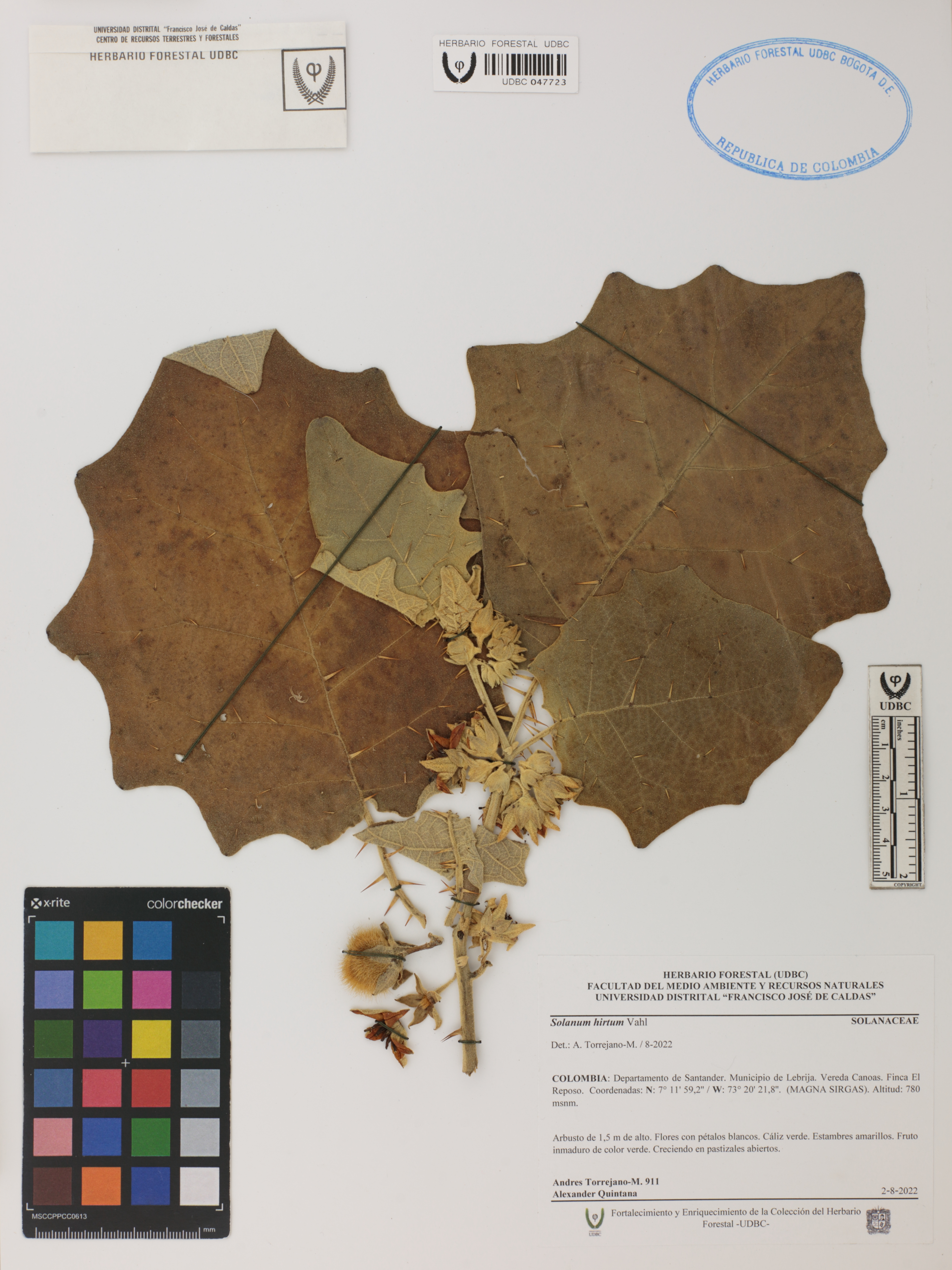 Fotografía del ejemplar Torrejano-M., Andrés 911, determinado como Solanum hirtum en el año 2022