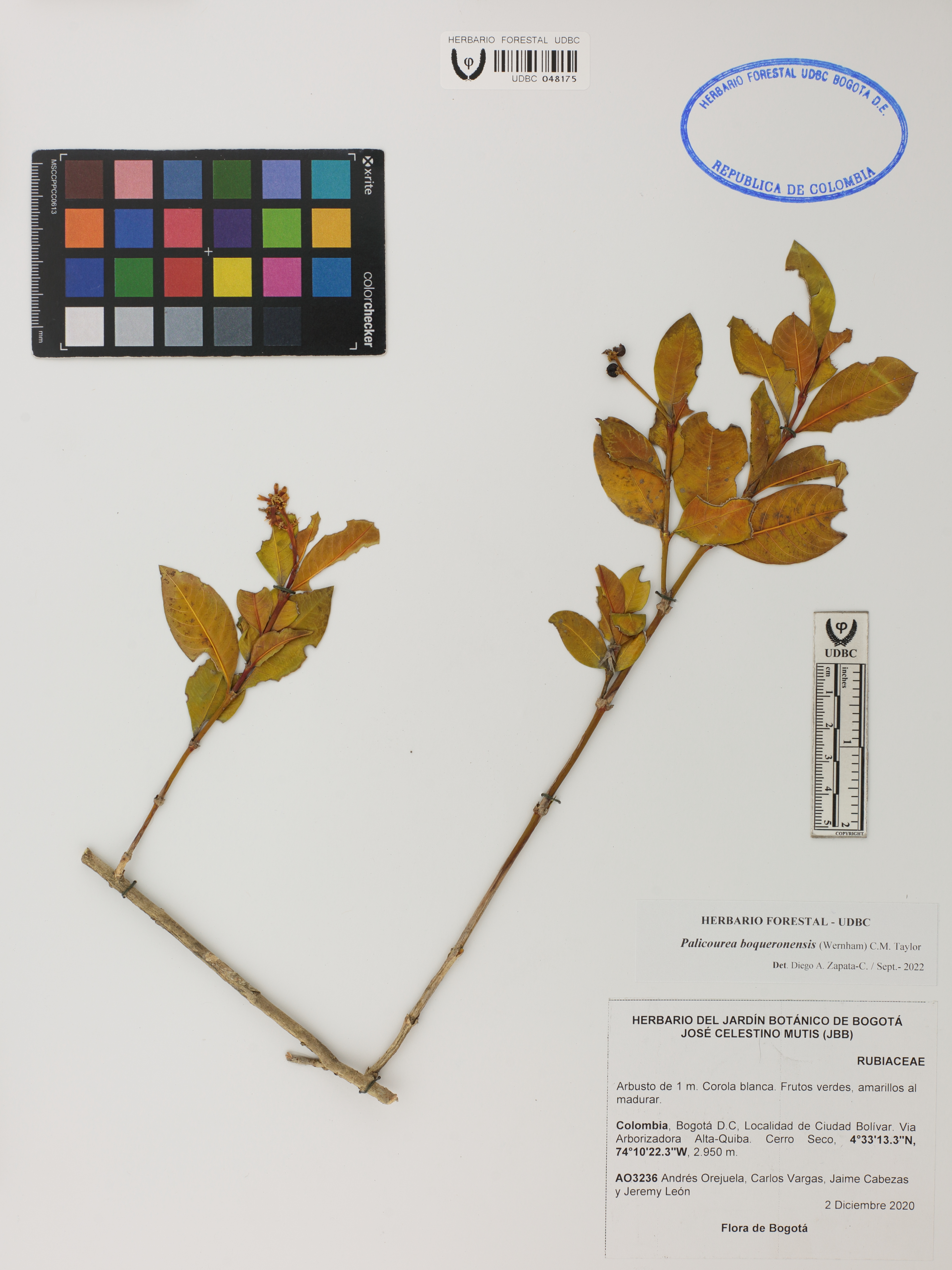 Fotografía del ejemplar Orejuela, A. 3236, determinado como Palicourea boqueronensis en el año 2022