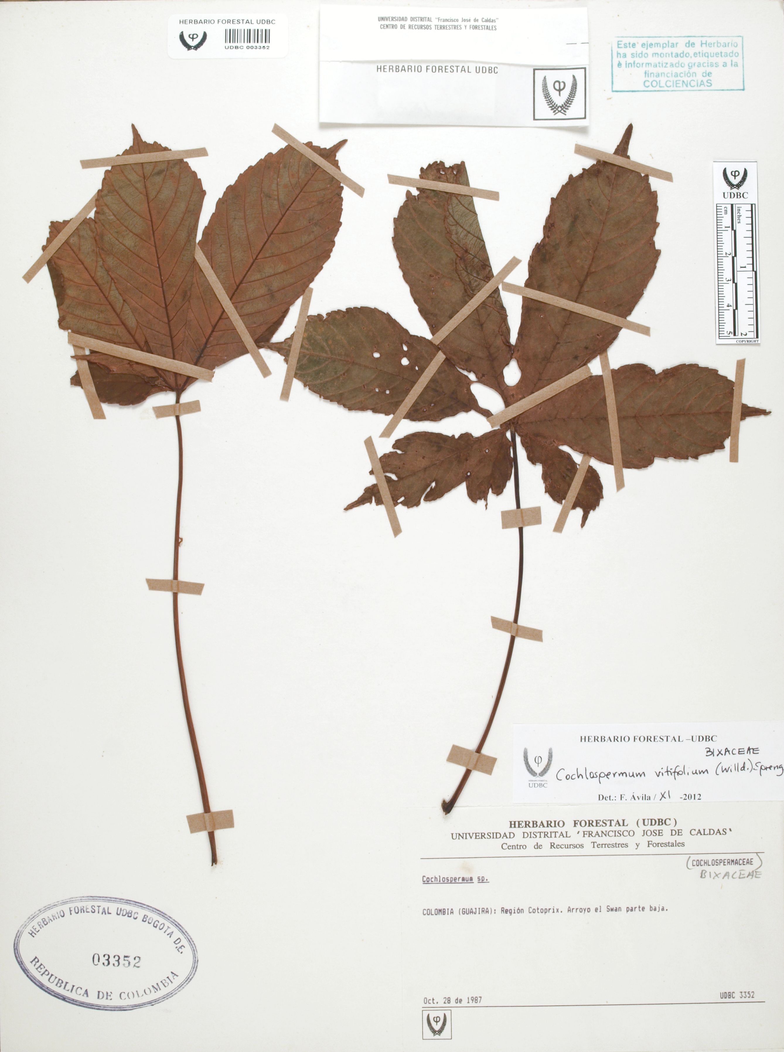 Fotografía del ejemplar SD, determinado como Cochlospermum vitifolium en el año 2012