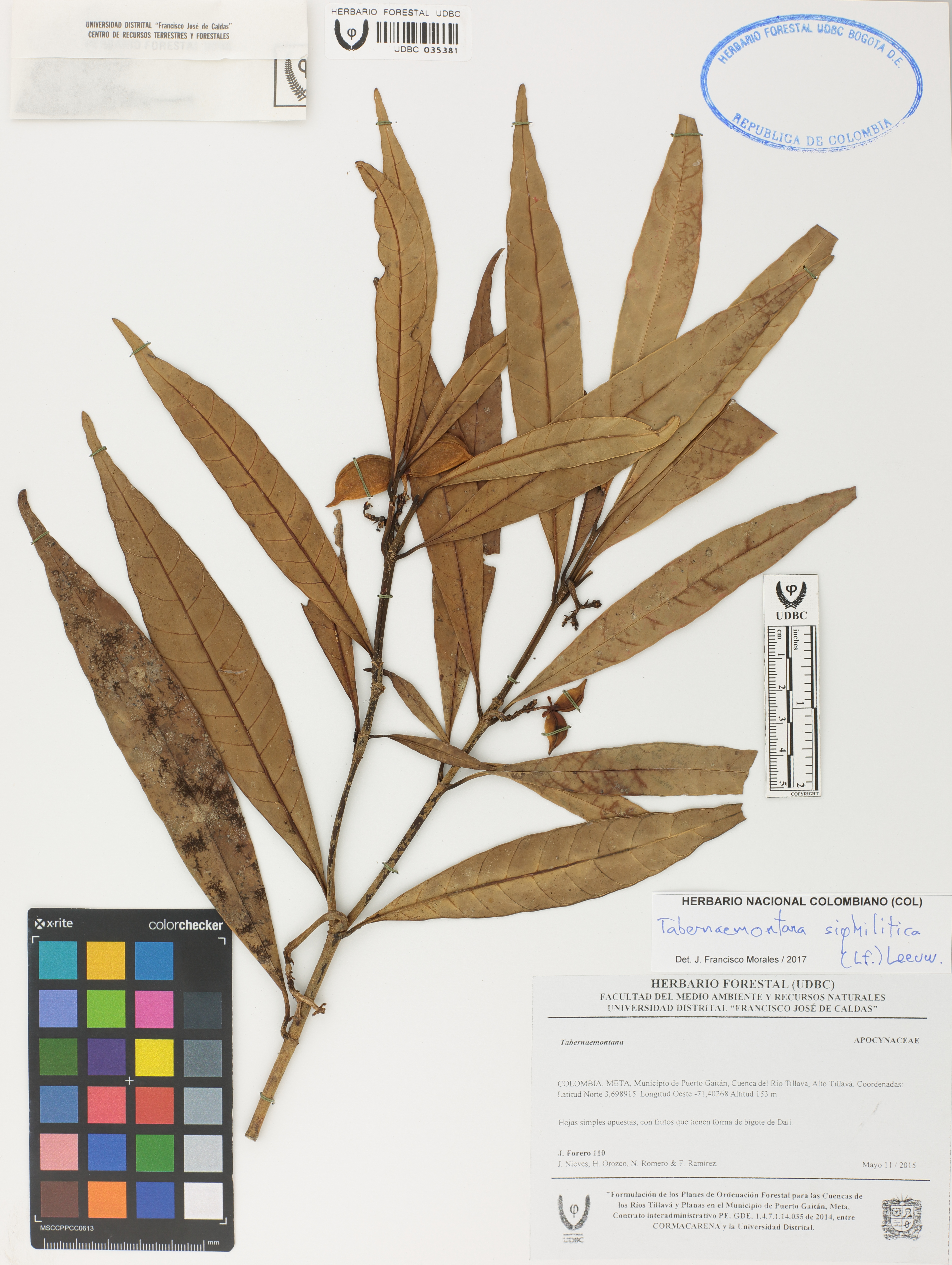 Fotografía del ejemplar Forero, J. 110, determinado como Tabernaemontana siphilitica en el año 2017