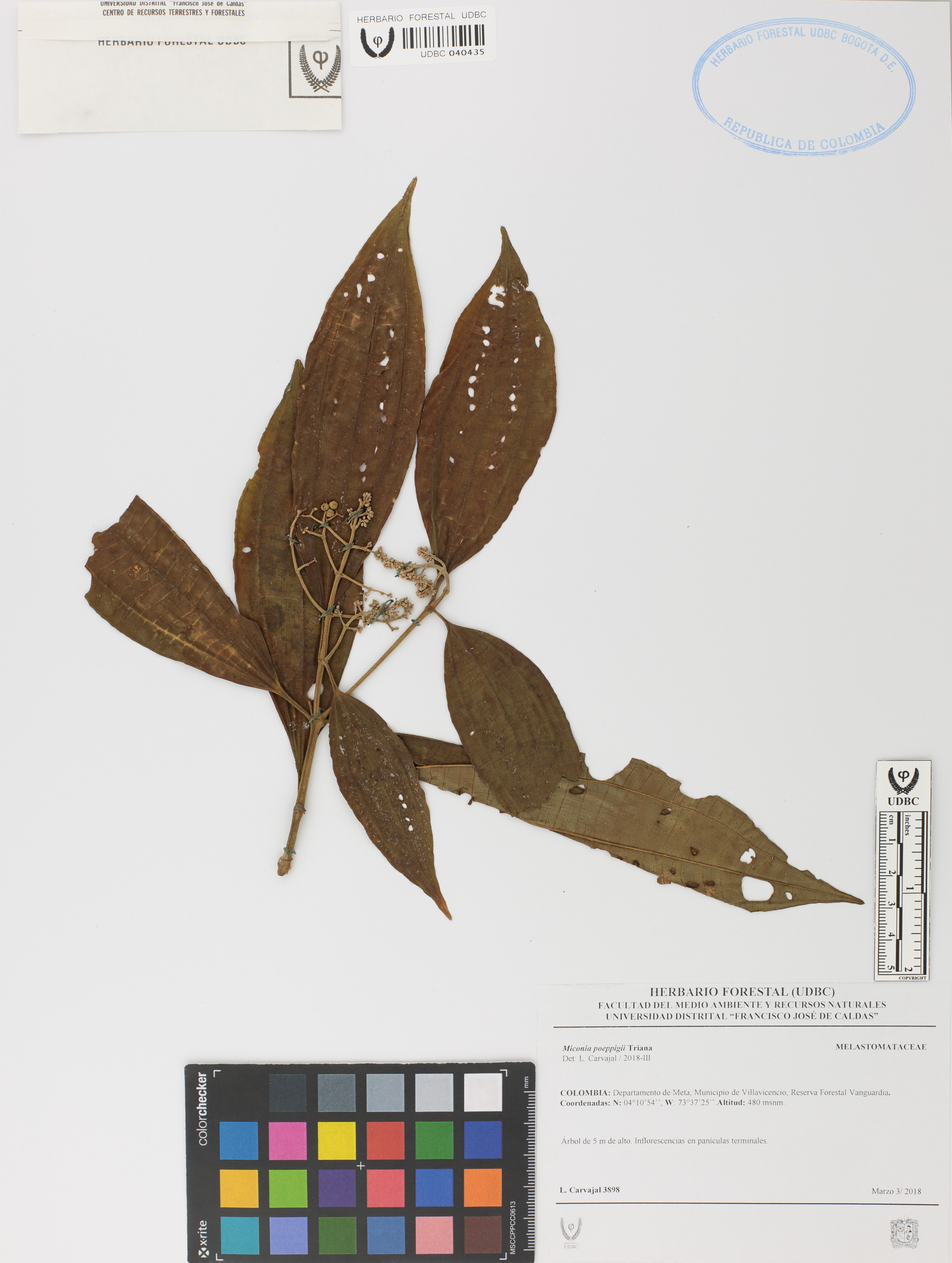 Fotografía del ejemplar Carvajal, L. 3898, determinado como Miconia poeppigii en el año 2018