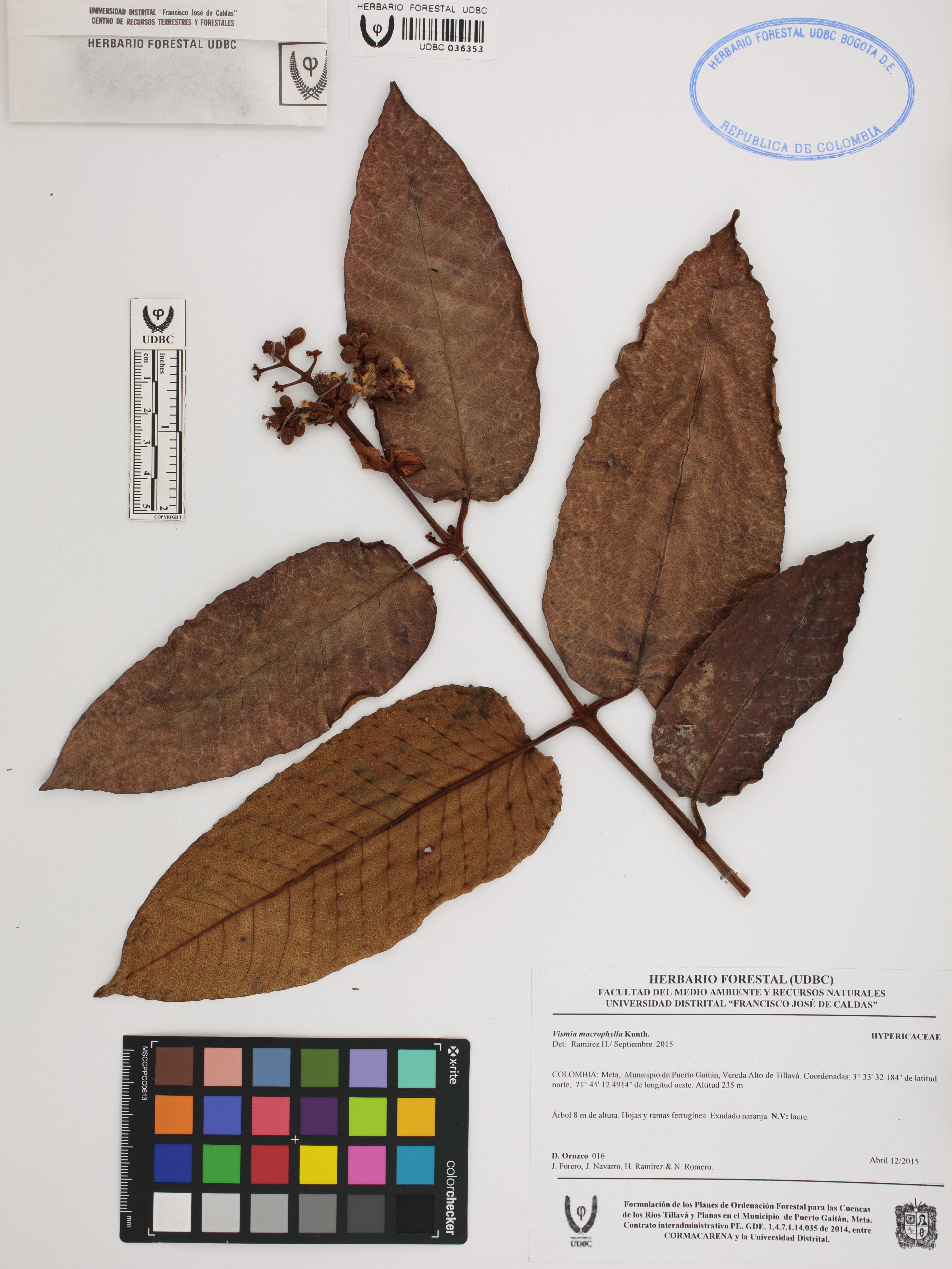 Fotografía del ejemplar Orozco, D. 16, determinado como Vismia macrophylla en el año 2015