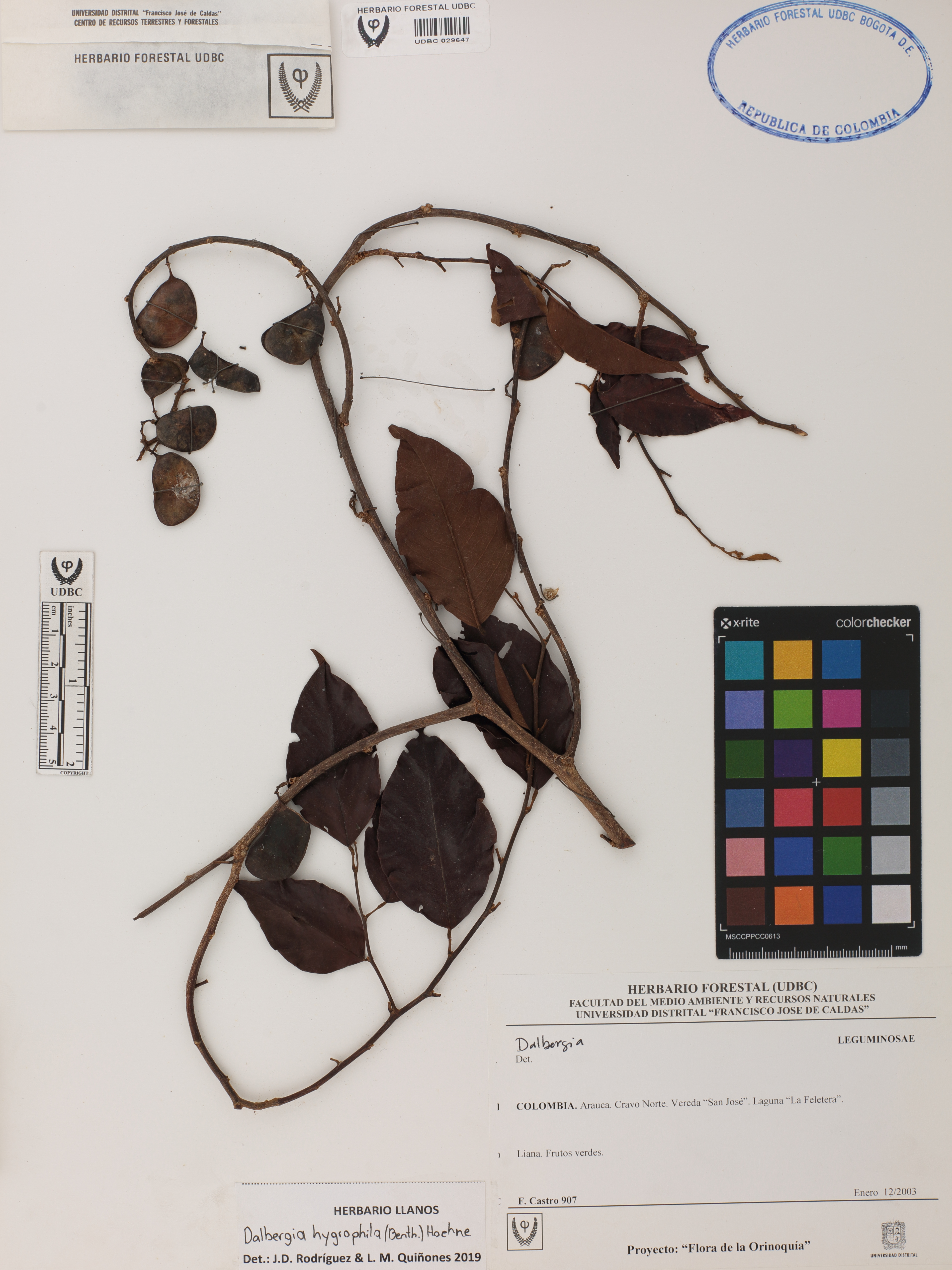 Fotografía del ejemplar Castro, F. 907, determinado como Dalbergia hygrophila en el año 2019