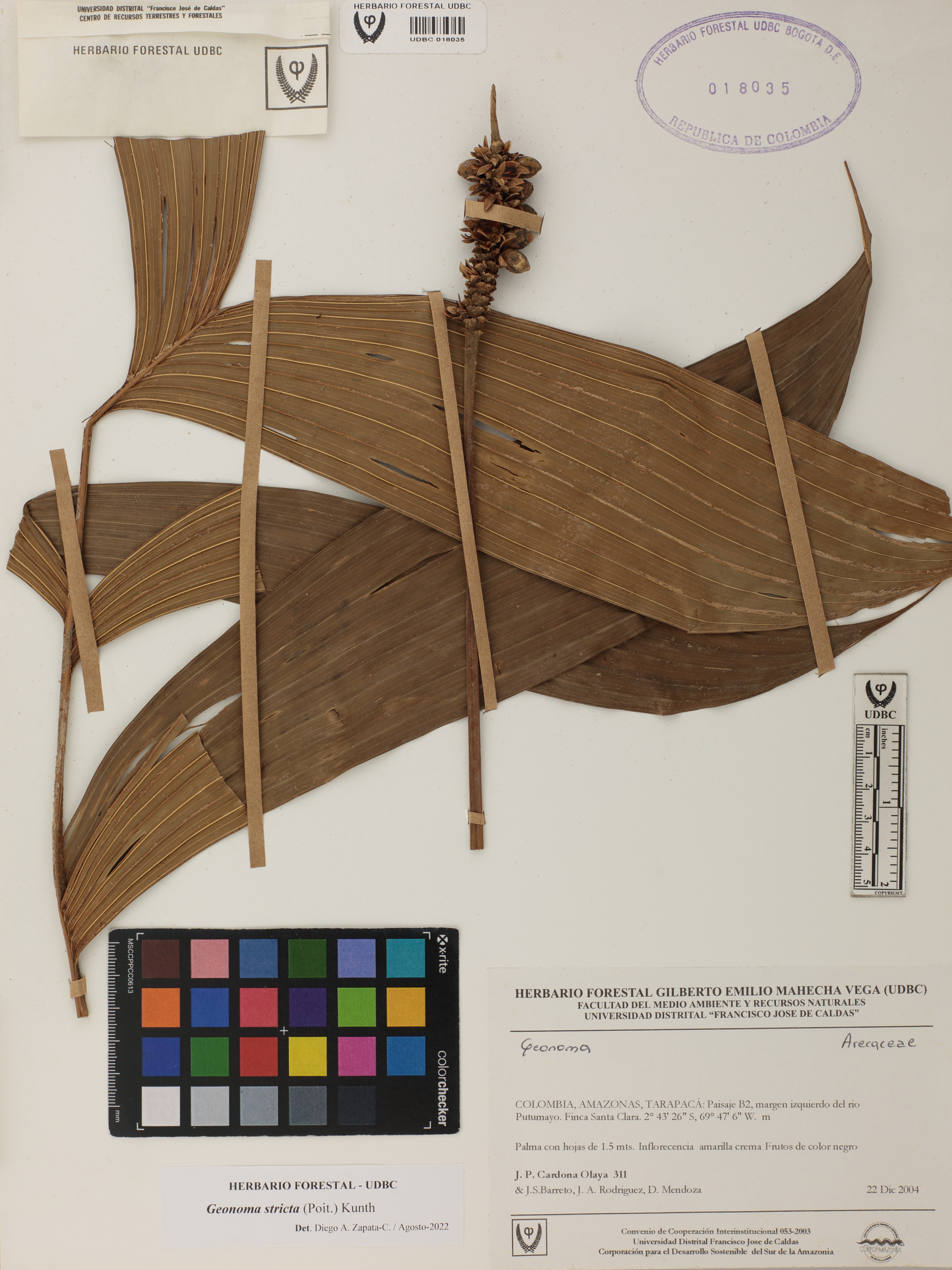 Fotografía del ejemplar Cardona, J. 311, determinado como Geonoma stricta en el año 2022