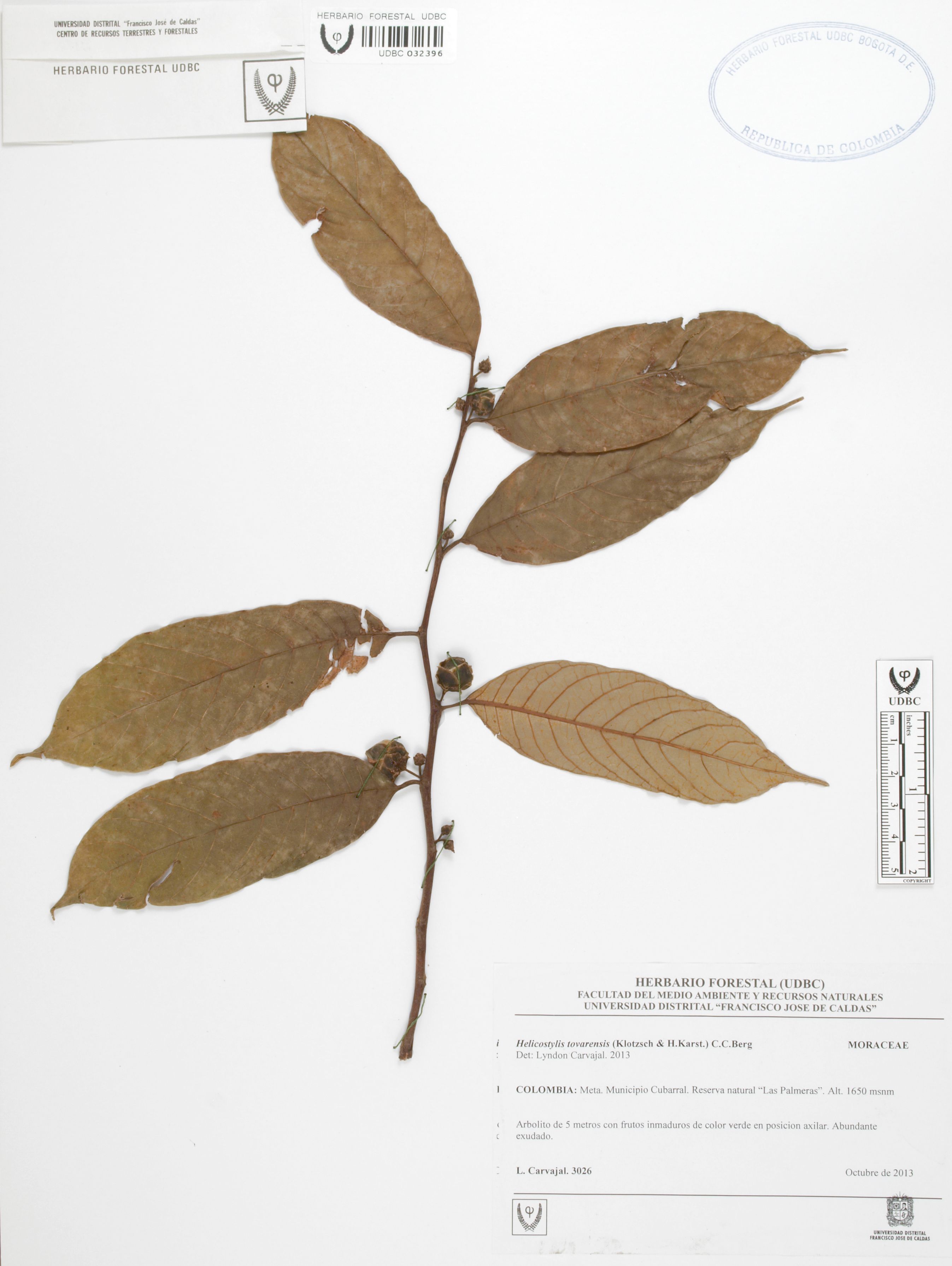Fotografía del ejemplar Carvajal, L. 3026, determinado como Helicostylis tovarensis en el año 2013