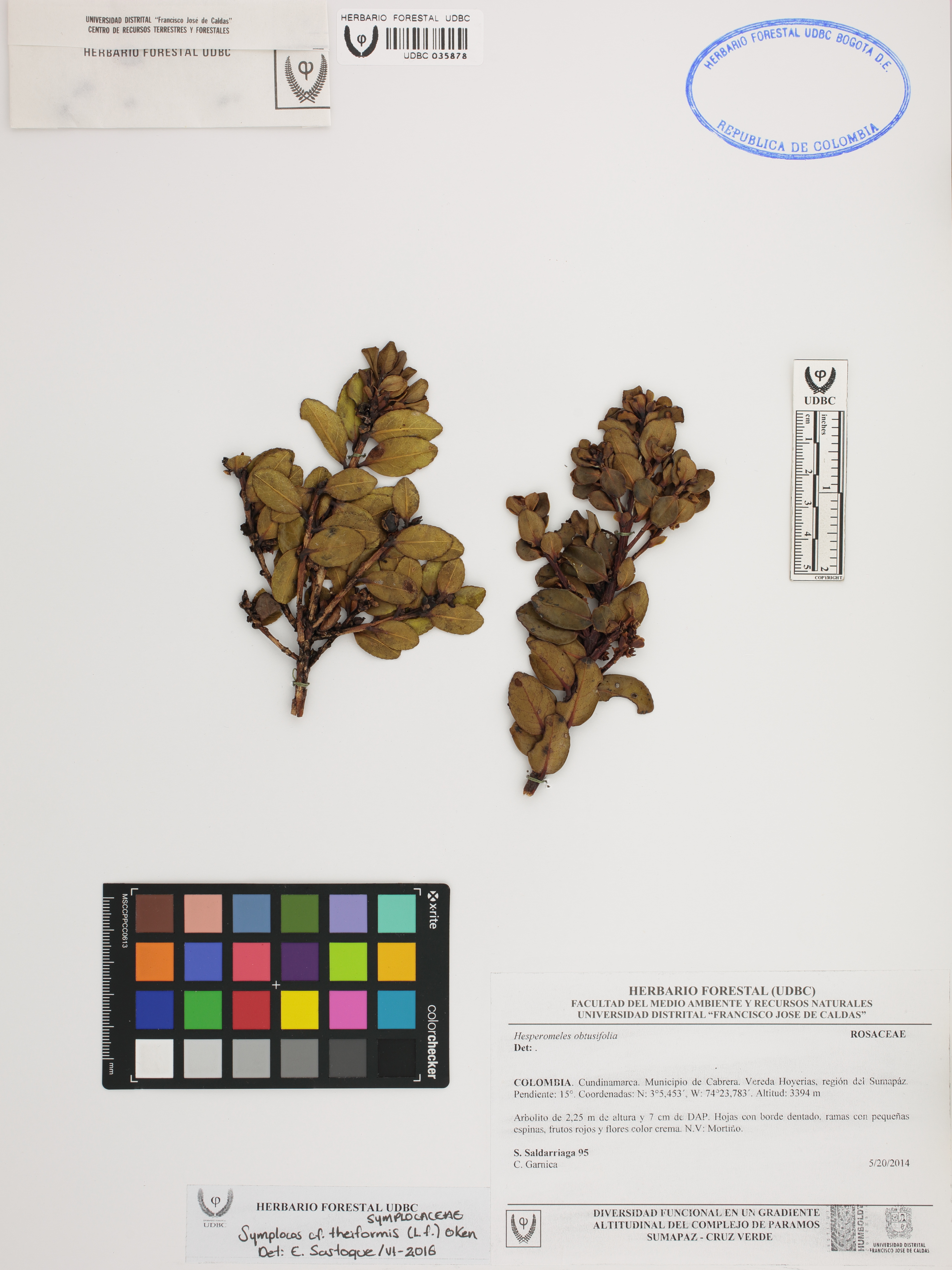 Fotografía del ejemplar Saldarriaga, S. 95, determinado como Symplocos theiformis en el año 2016