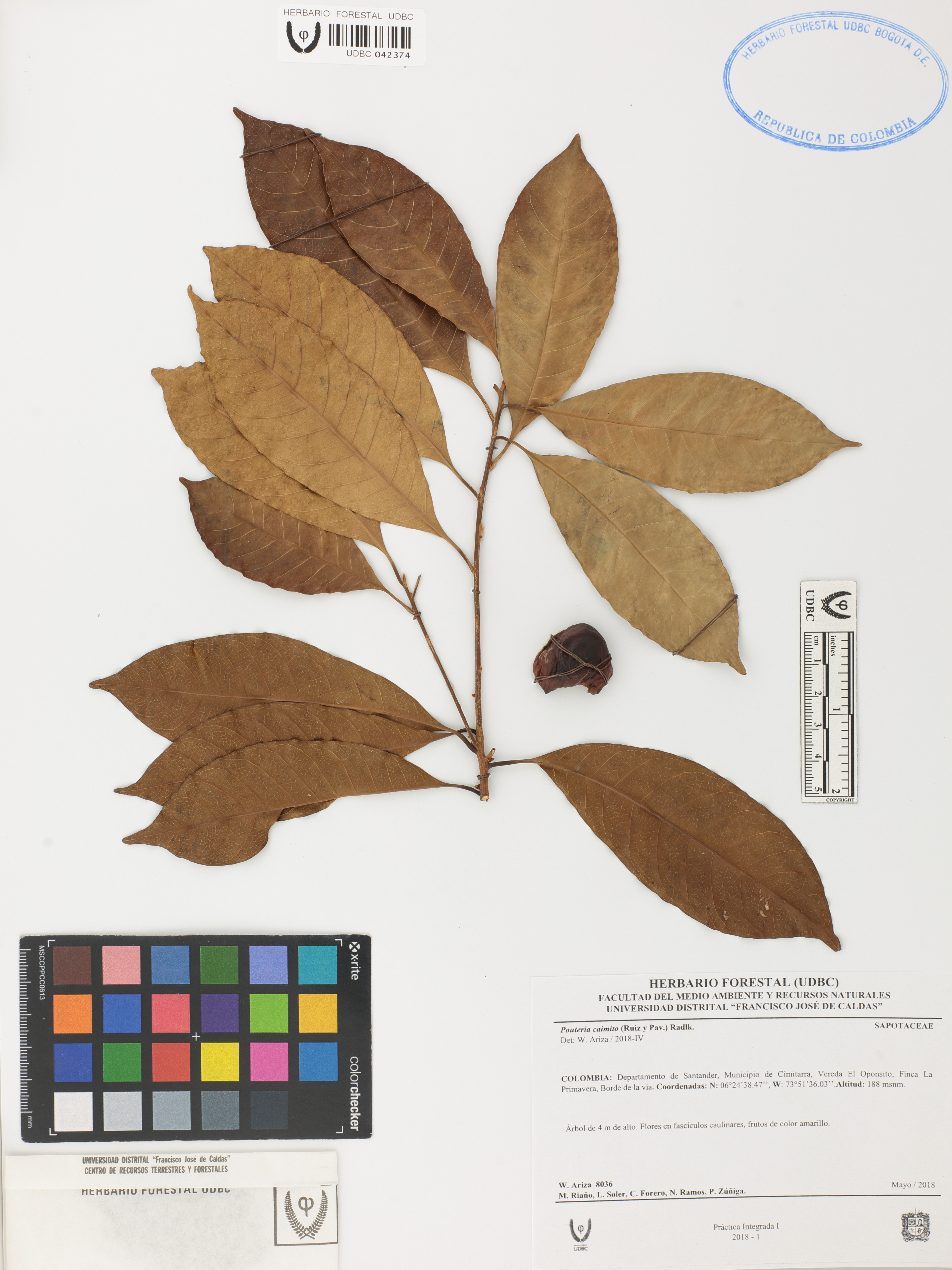 Fotografía del ejemplar Ariza, W. 8036, determinado como Pouteria caimito en el año 2018