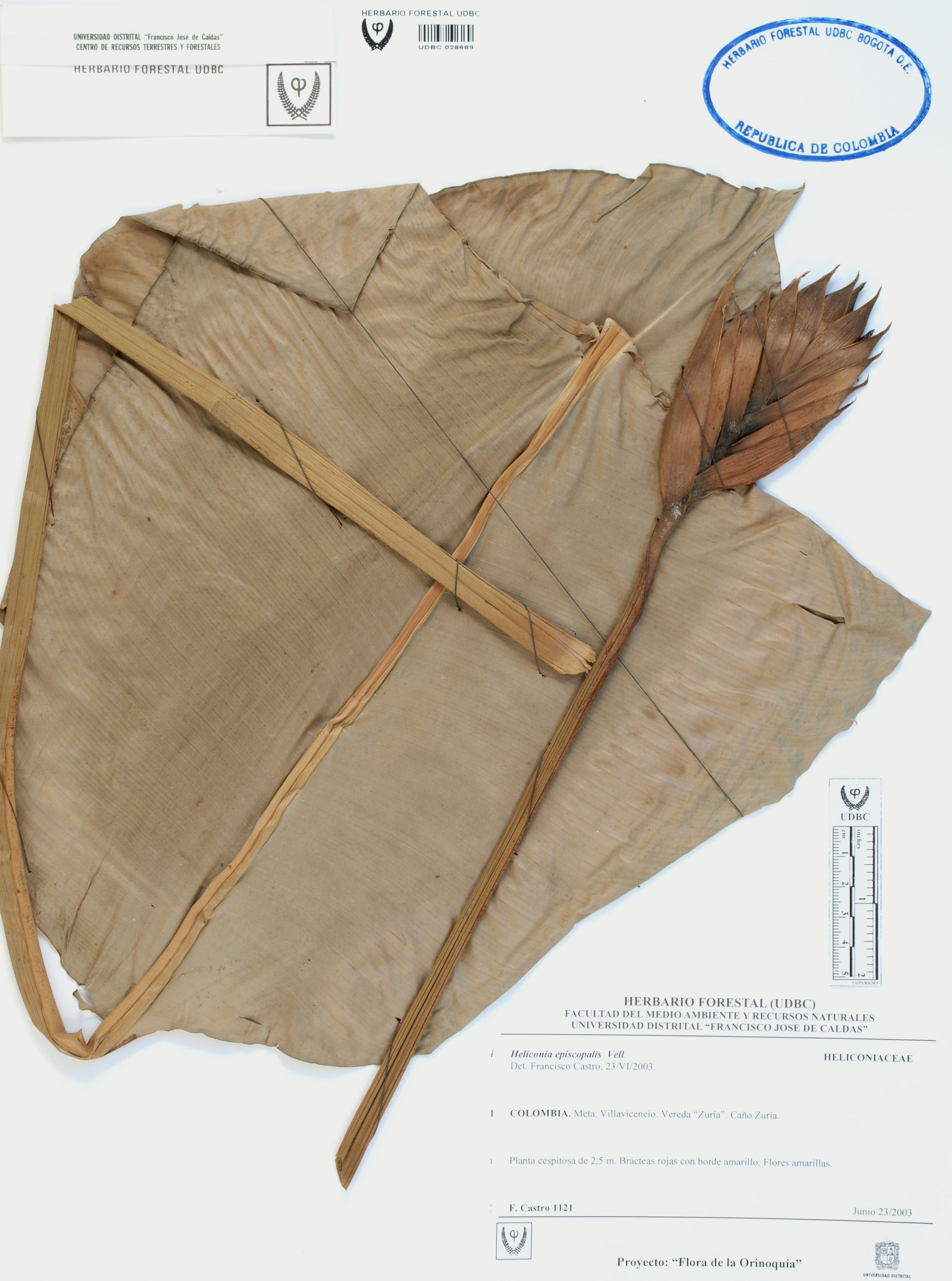 Fotografía del ejemplar Castro, F. 1121, determinado como Heliconia episcopalis en el año 2003