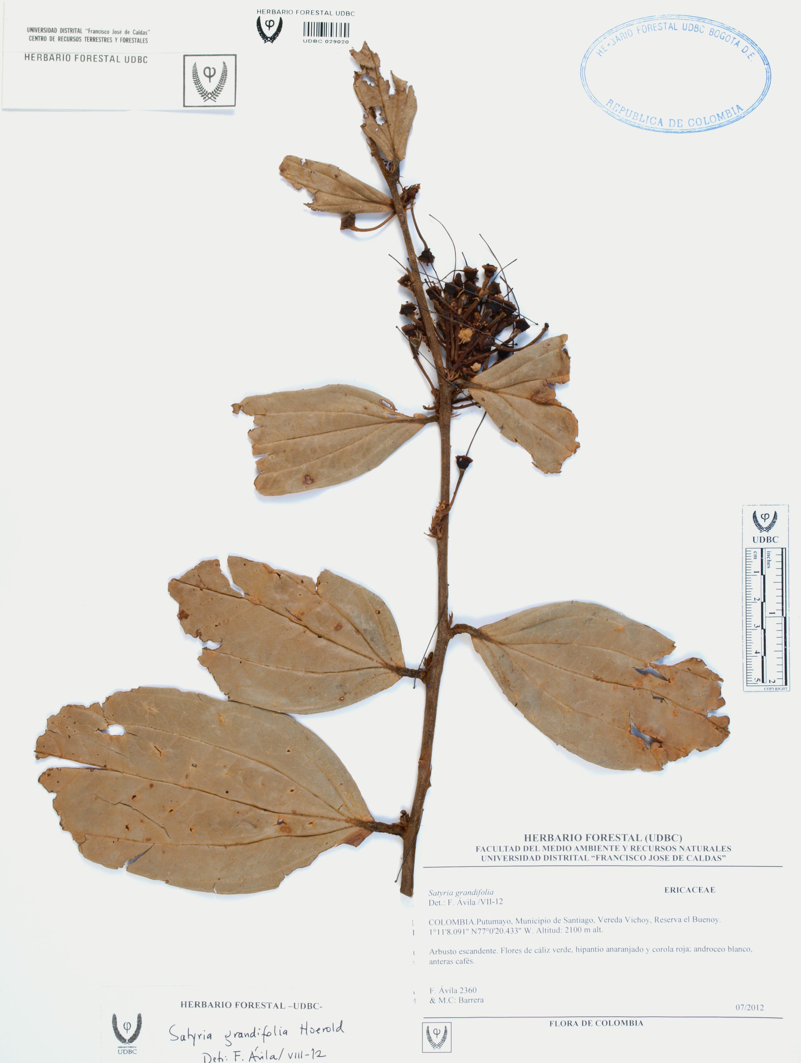 Fotografía del ejemplar Ávila, F. 2360, determinado como Satyria grandifolia en el año 2012