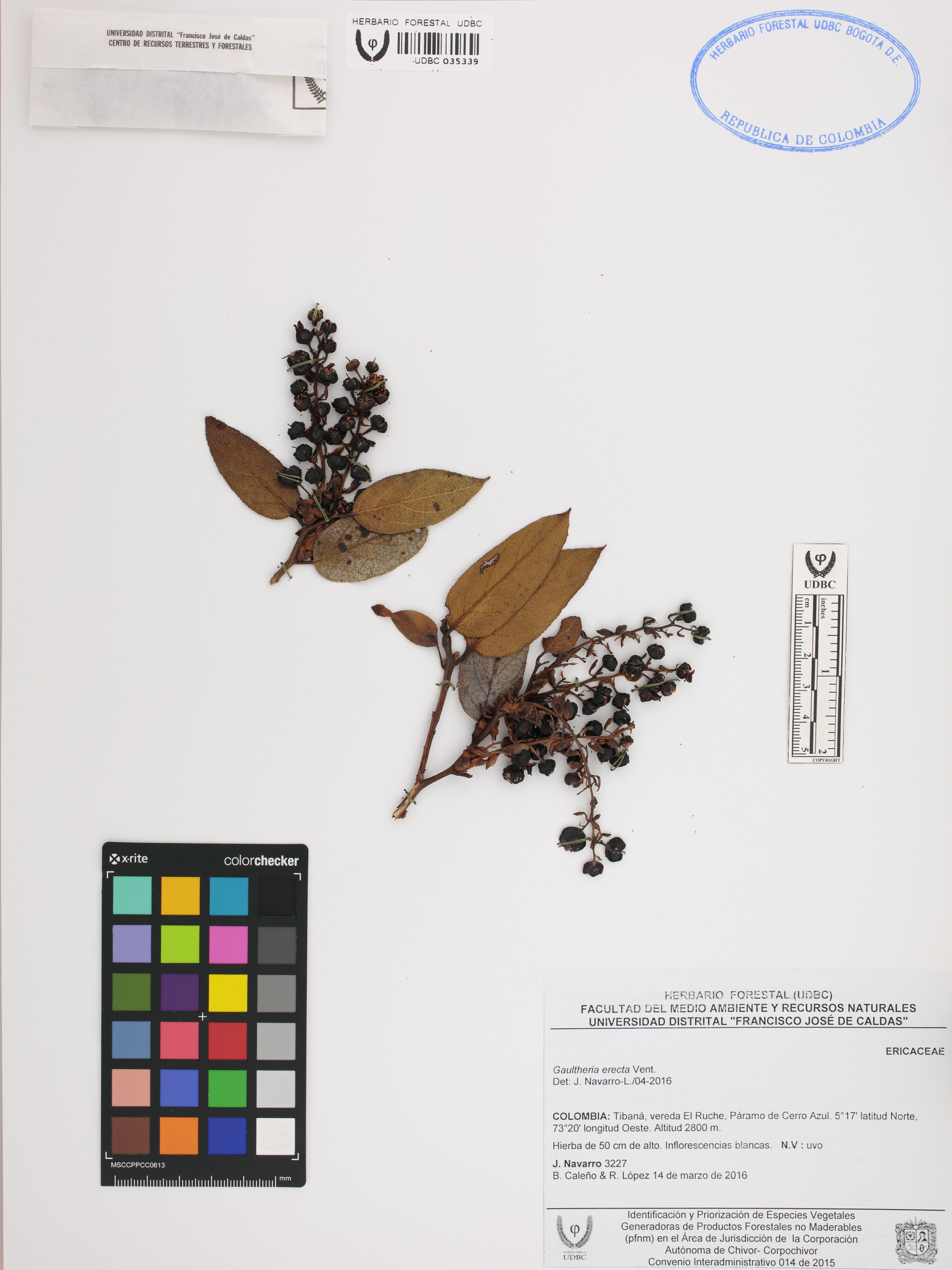 Fotografía del ejemplar Navarro, J. 3227, determinado como Gaultheria erecta en el año 2016