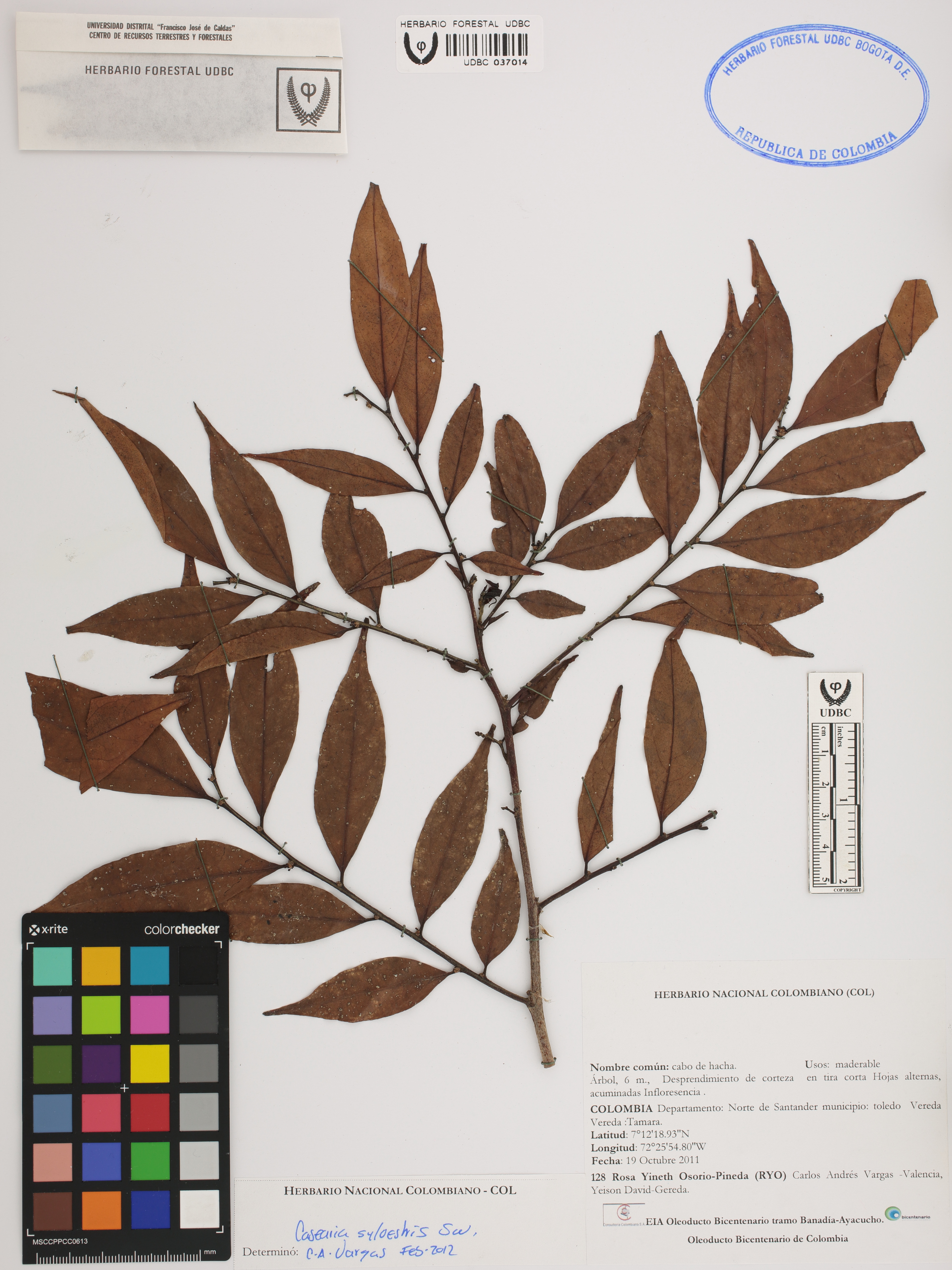 Fotografía del ejemplar Osorio-P., R. 128, determinado como Casearia sylvestris en el año 2012