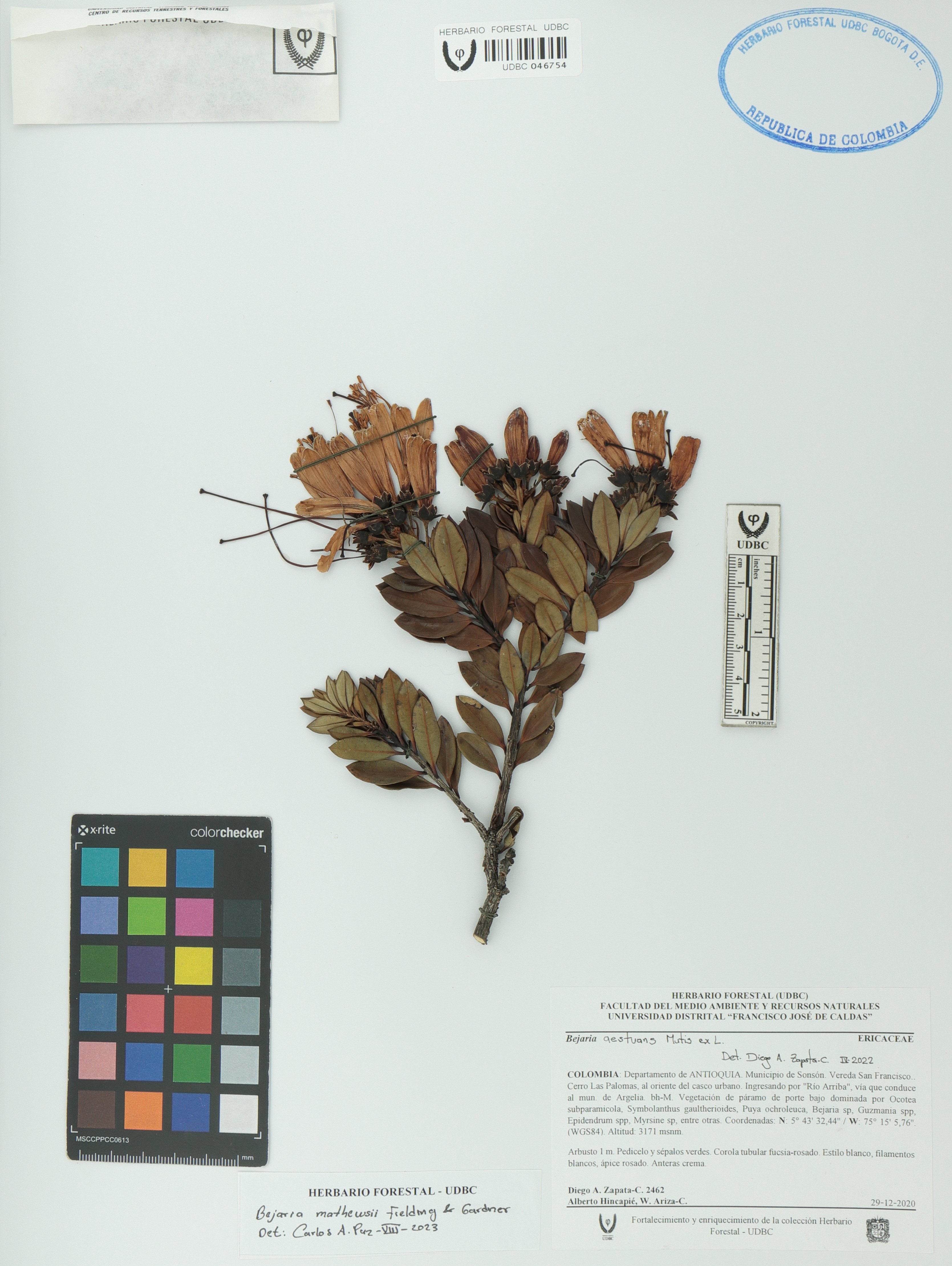 | dc.description | Fotografía del ejemplar Zapata-C., D. 2462, determinado como Bejaria mathewsii en el año 2023 | |