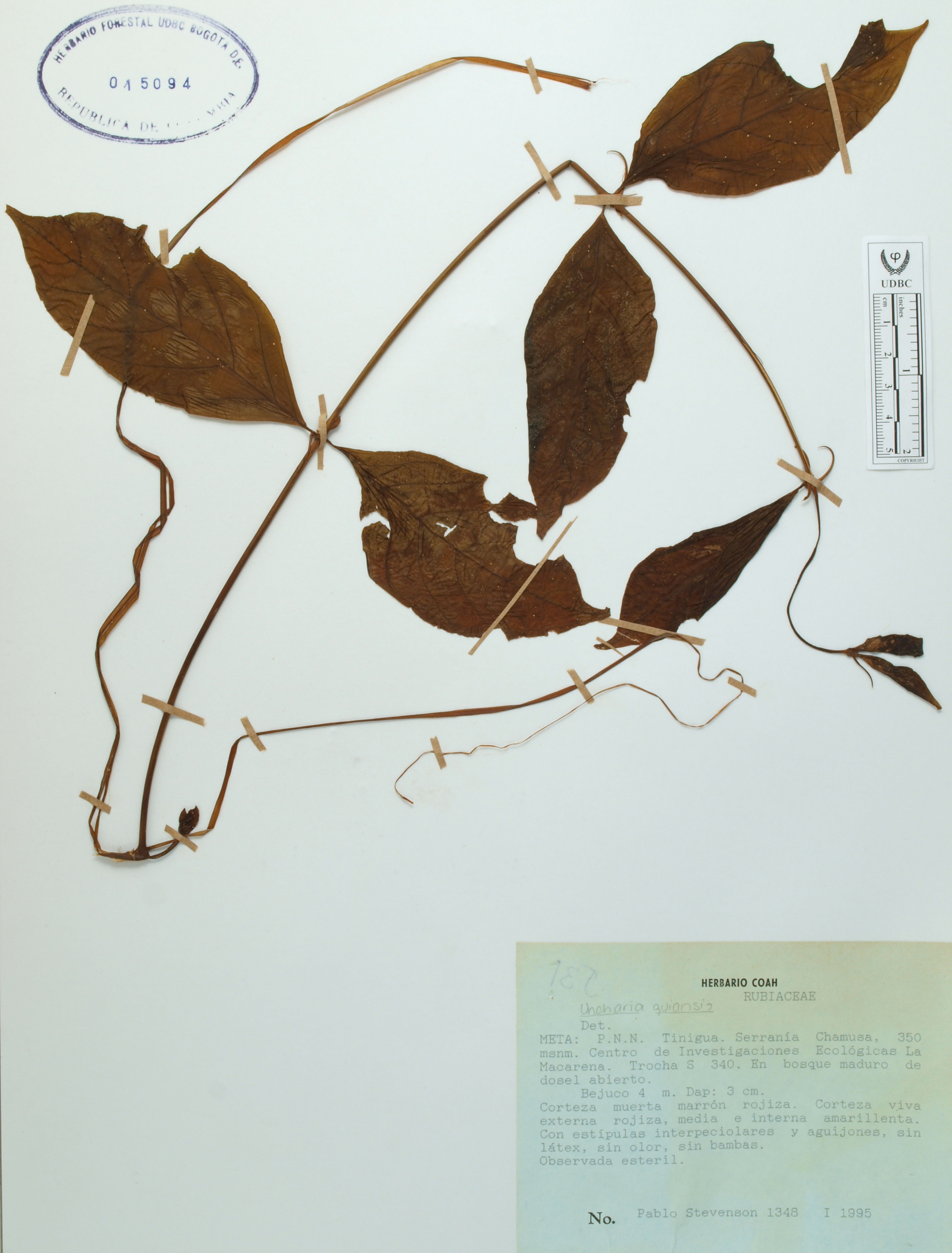 Fotografía del ejemplar Stevenson, P. 1348, determinado como Uncaria guianensis