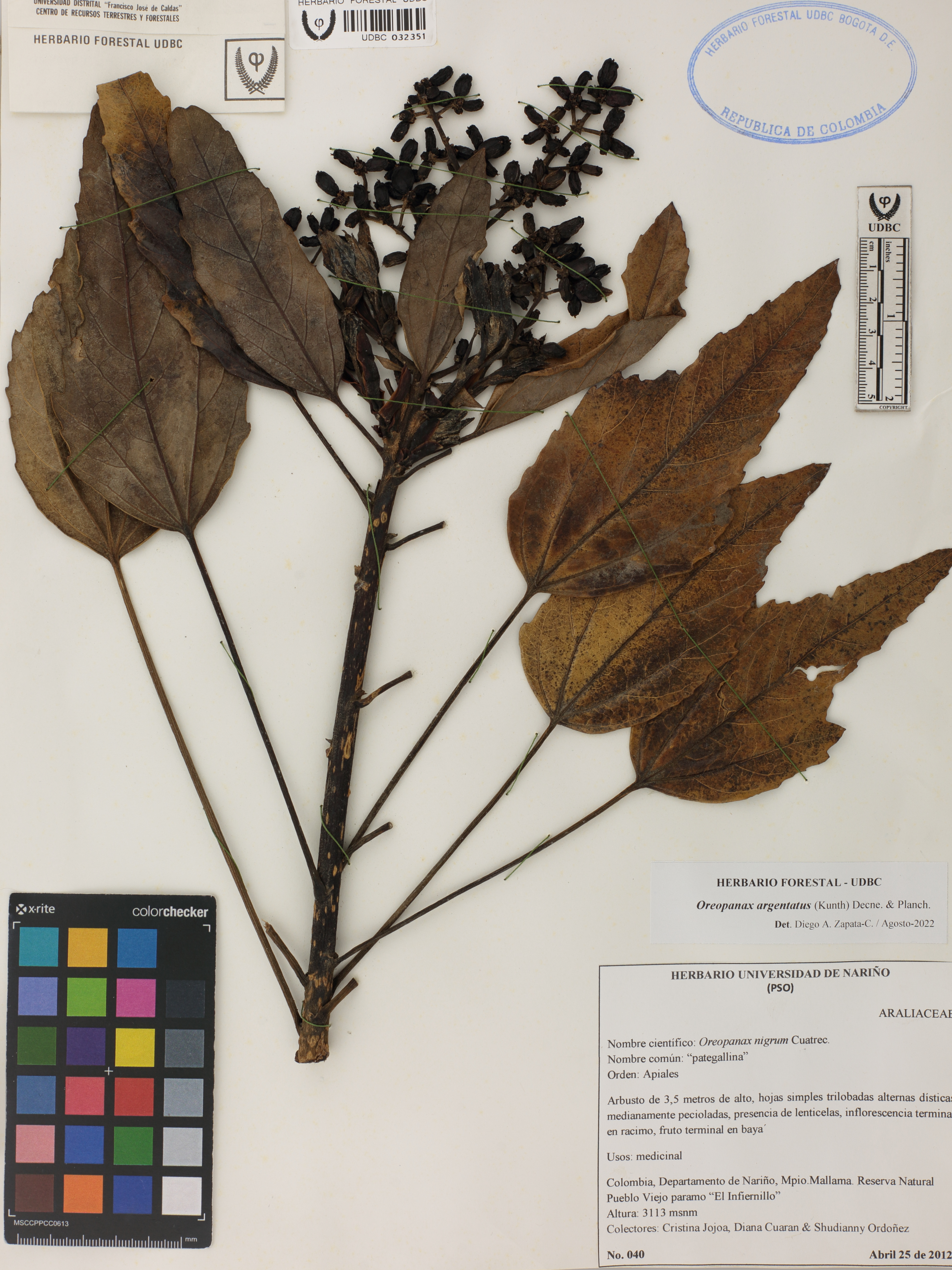 Fotografía del ejemplar Jojoa, C. 40, determinado como Oreopanax argentatus en el año 2022