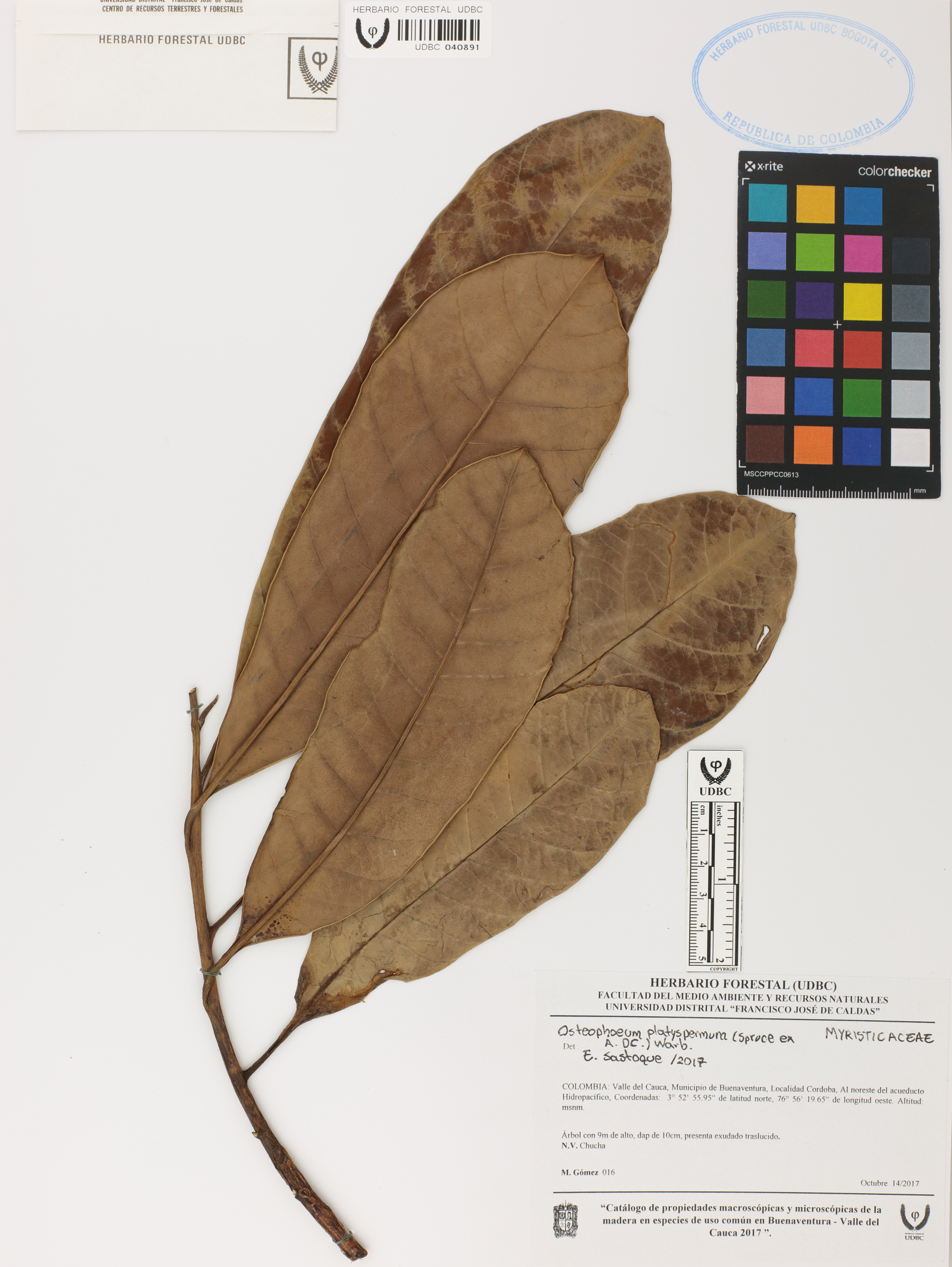 Fotografía del ejemplar Gómez, M. 16, determinado como Osteophloeum platyspermum en el año 2017
