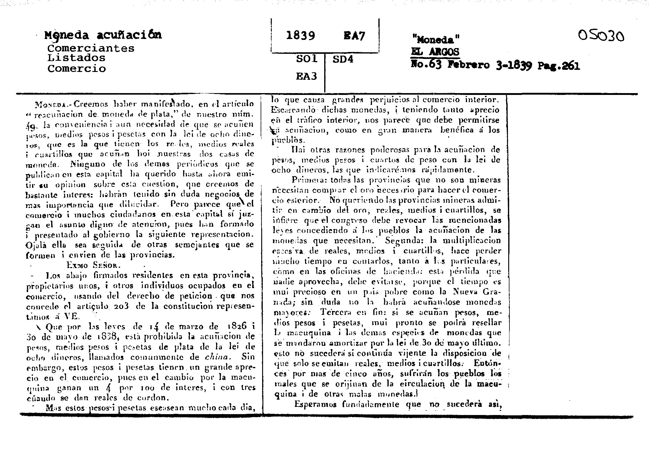 | dc.description.abstract | The image contains news about a group of merchants who meet to request the government to allow the minting of coins that have been prohibited in the law of eight coins because they are highly valued by them and their scarcity. impacts the country's internal trade. News published in El Argos, February 3, 1839. | spa |
