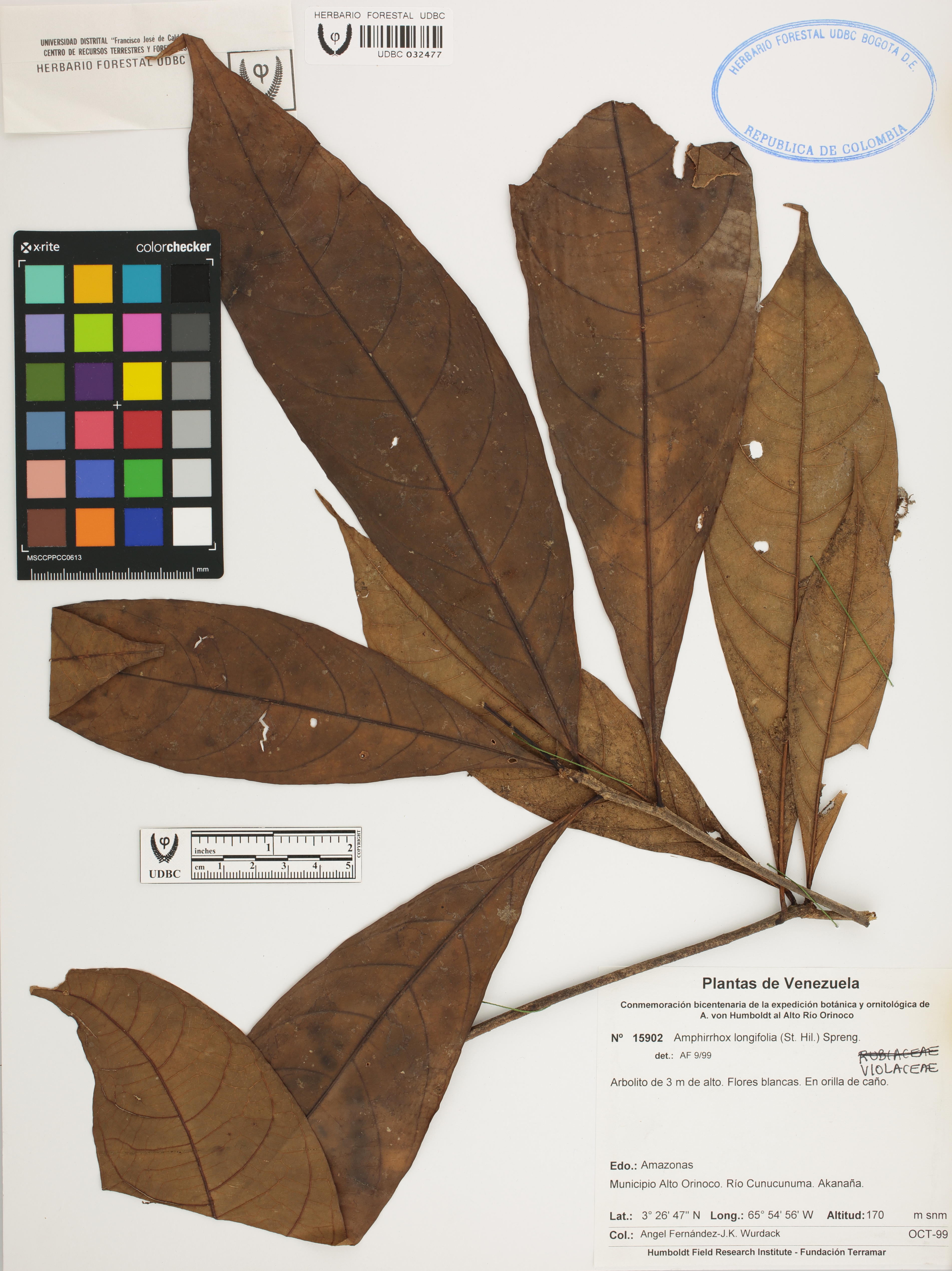 Fotografía del ejemplar Fernández-J., A. 15902, determinado como Amphirrhox longifolia en el año 1999