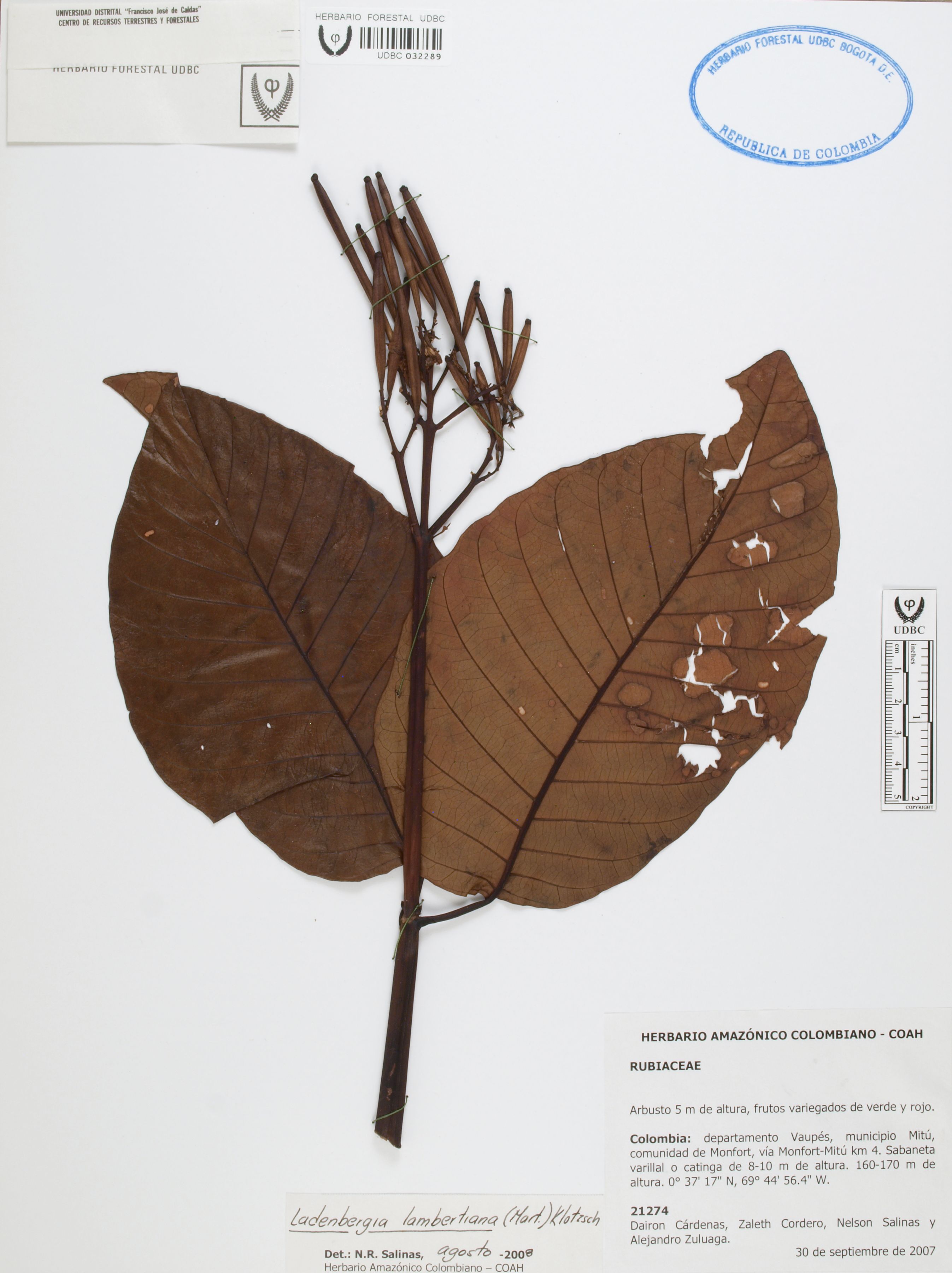 Fotografía del ejemplar Cárdenas, D. 21274, determinado como Ladenbergia lambertiana en el año 2008