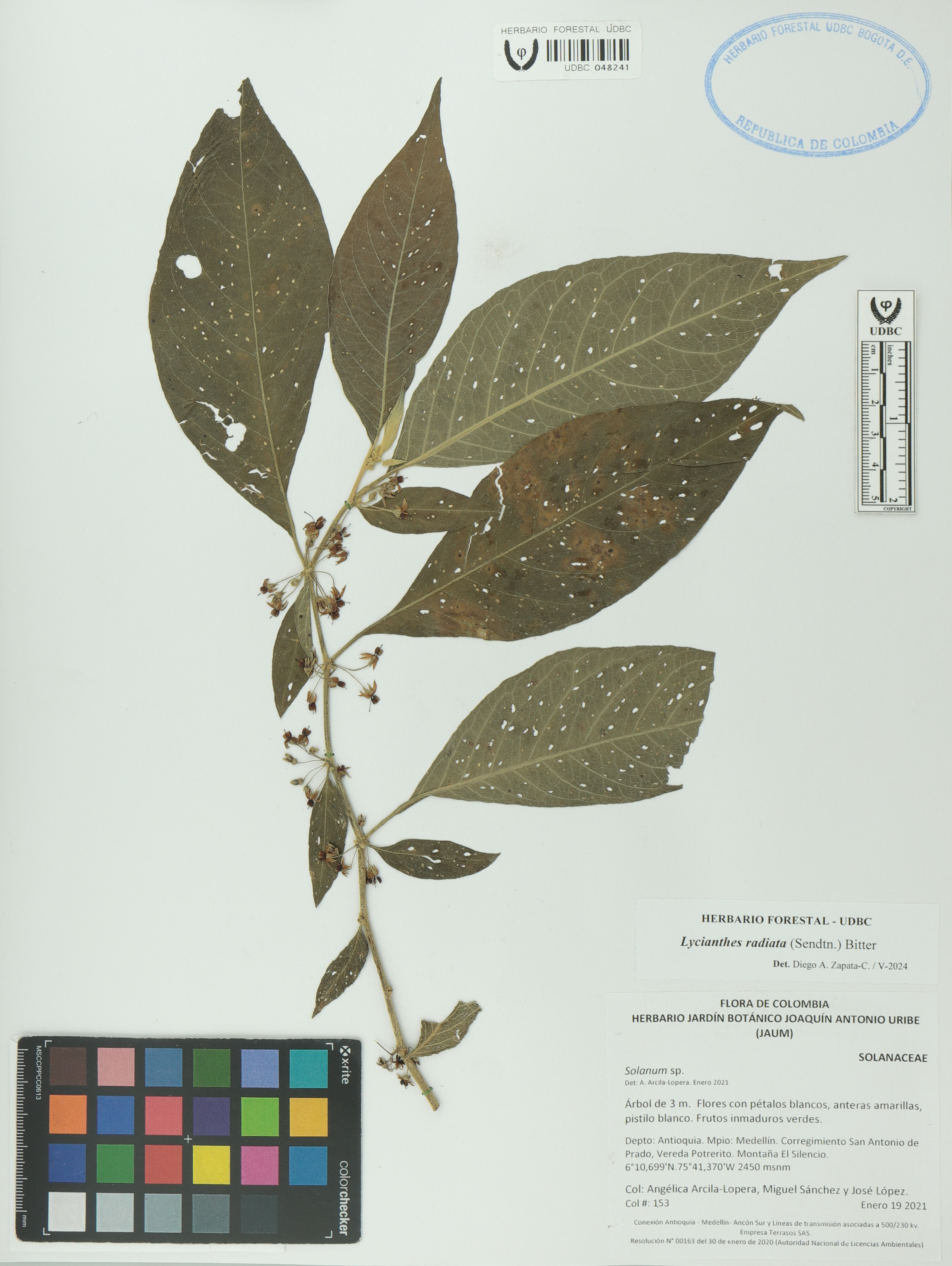 | dc.description | Fotografía del ejemplar Arcila-L., A. 153, determinado como Lycianthes radiata en el año 2024 | |