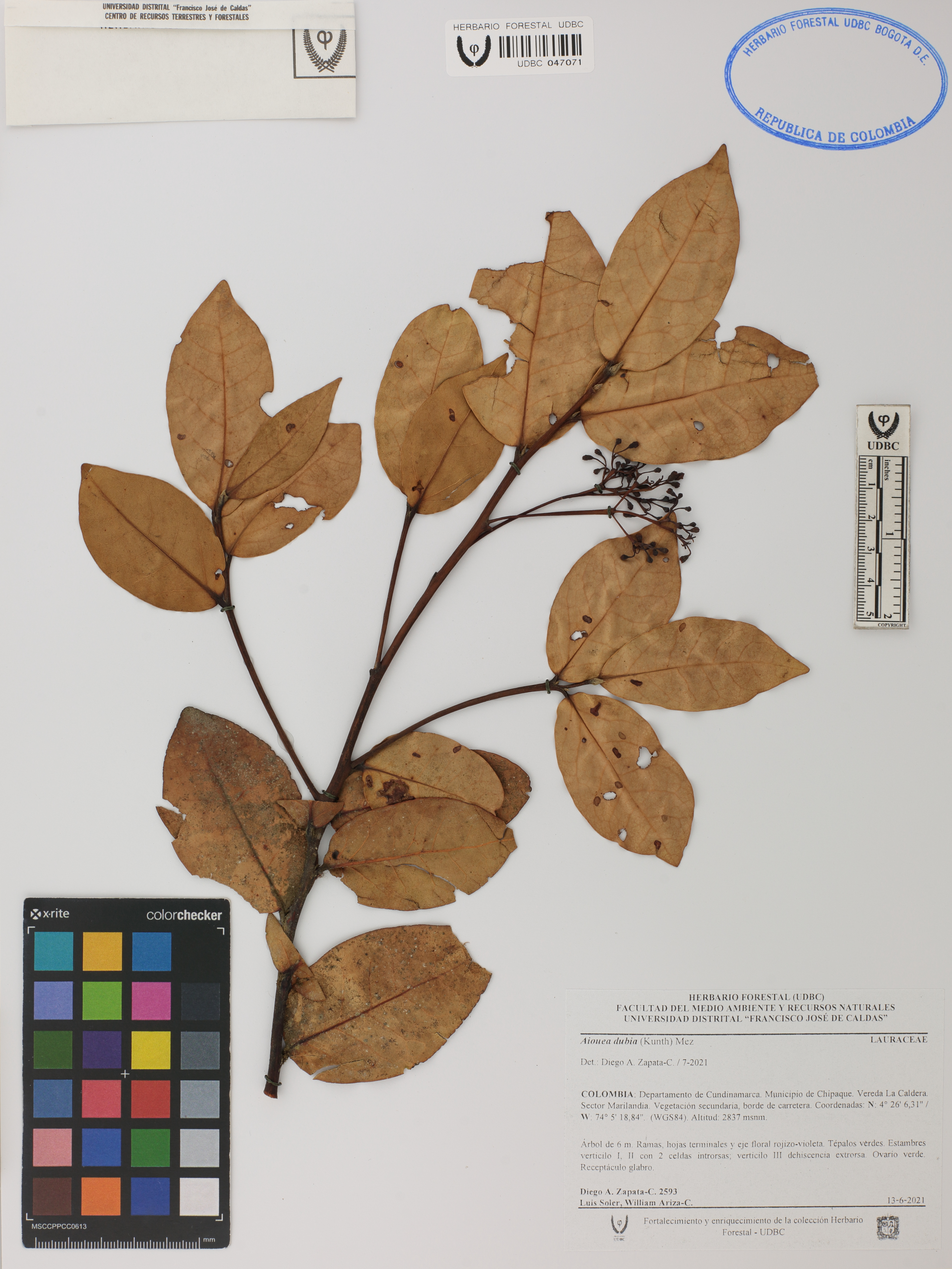 | dc.description | Fotografía del ejemplar Zapata-C., D. 2593, determinado como Aiouea dubia en el año 2021 | |