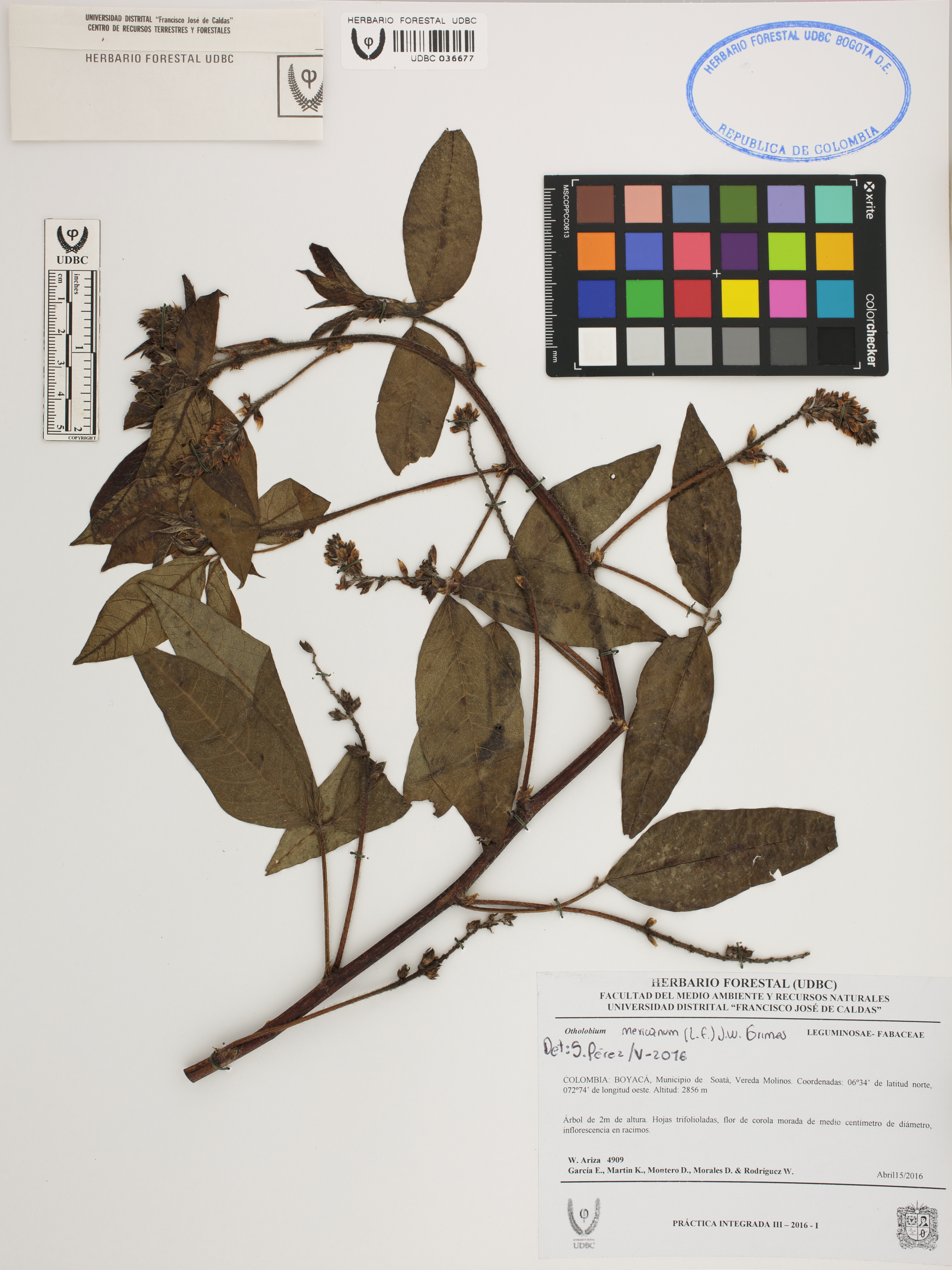 Fotografía del ejemplar Ariza, W. 4909, determinado como Otholobium mexicanum en el año 2016