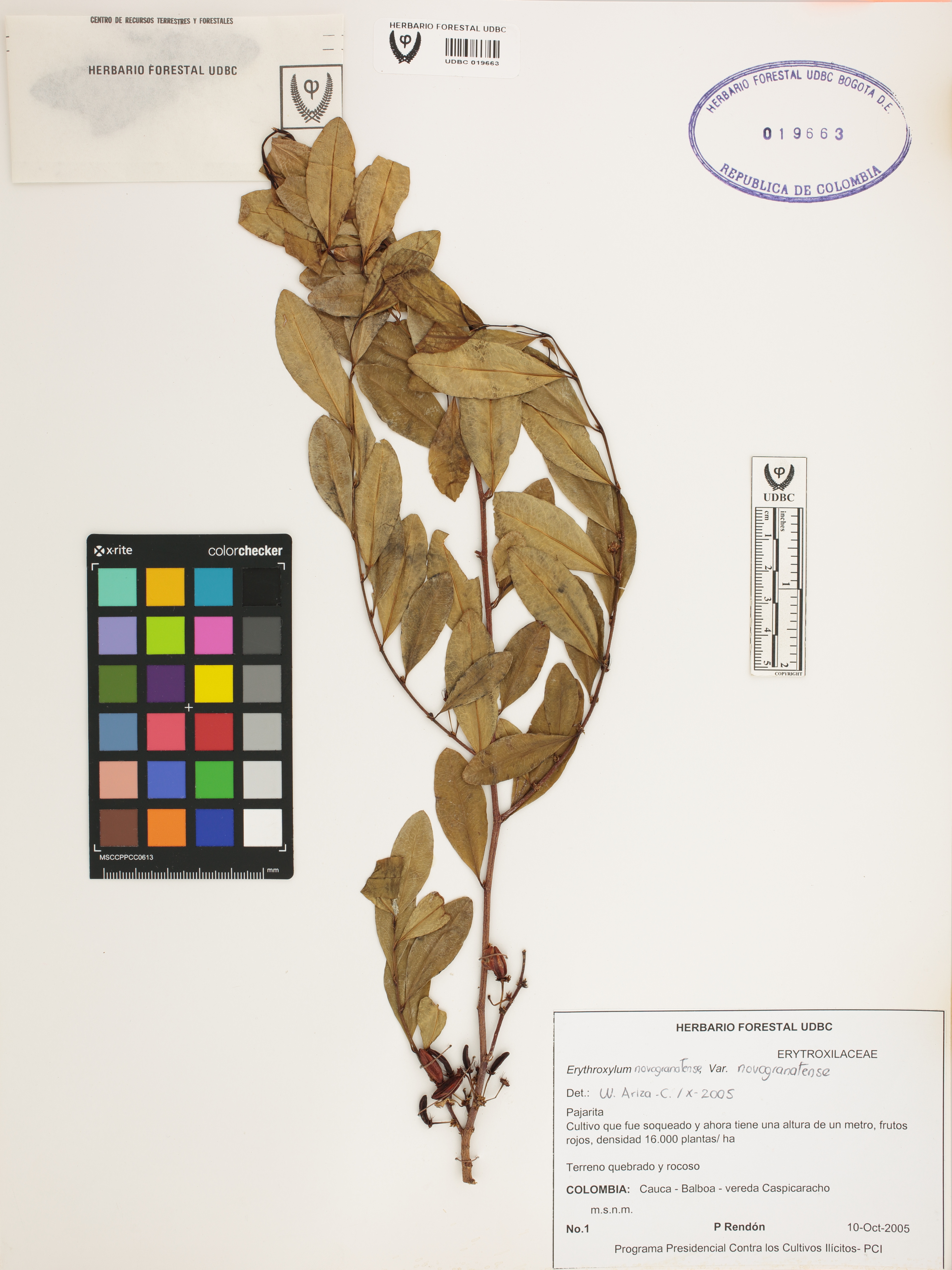 Fotografía del ejemplar Rendón, P. 1, determinado como Erythroxylum novogranatense var. novogranatense en el año 2005