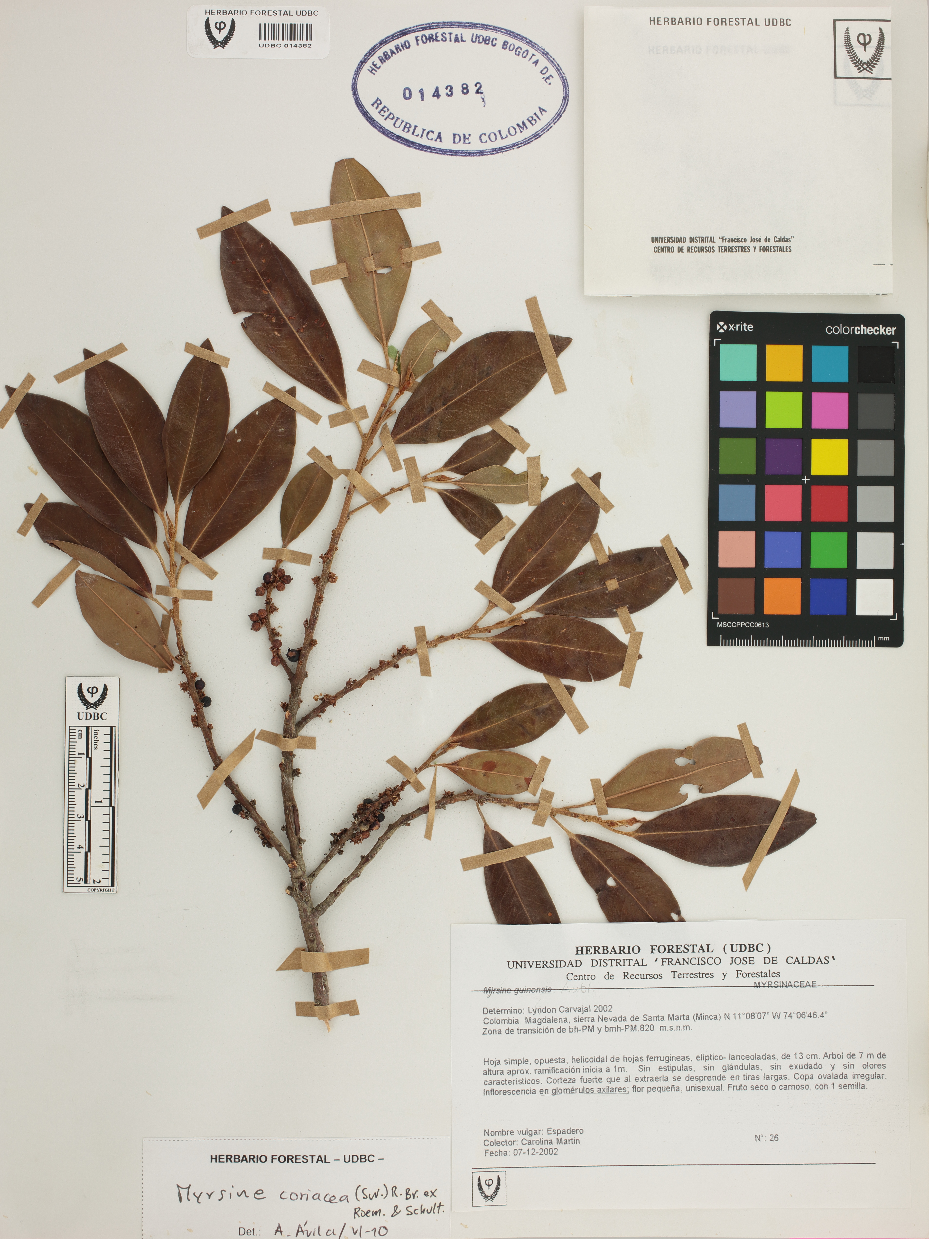 Fotografía del ejemplar Martín, C. 26, determinado como Myrsine coriacea en el año 2010