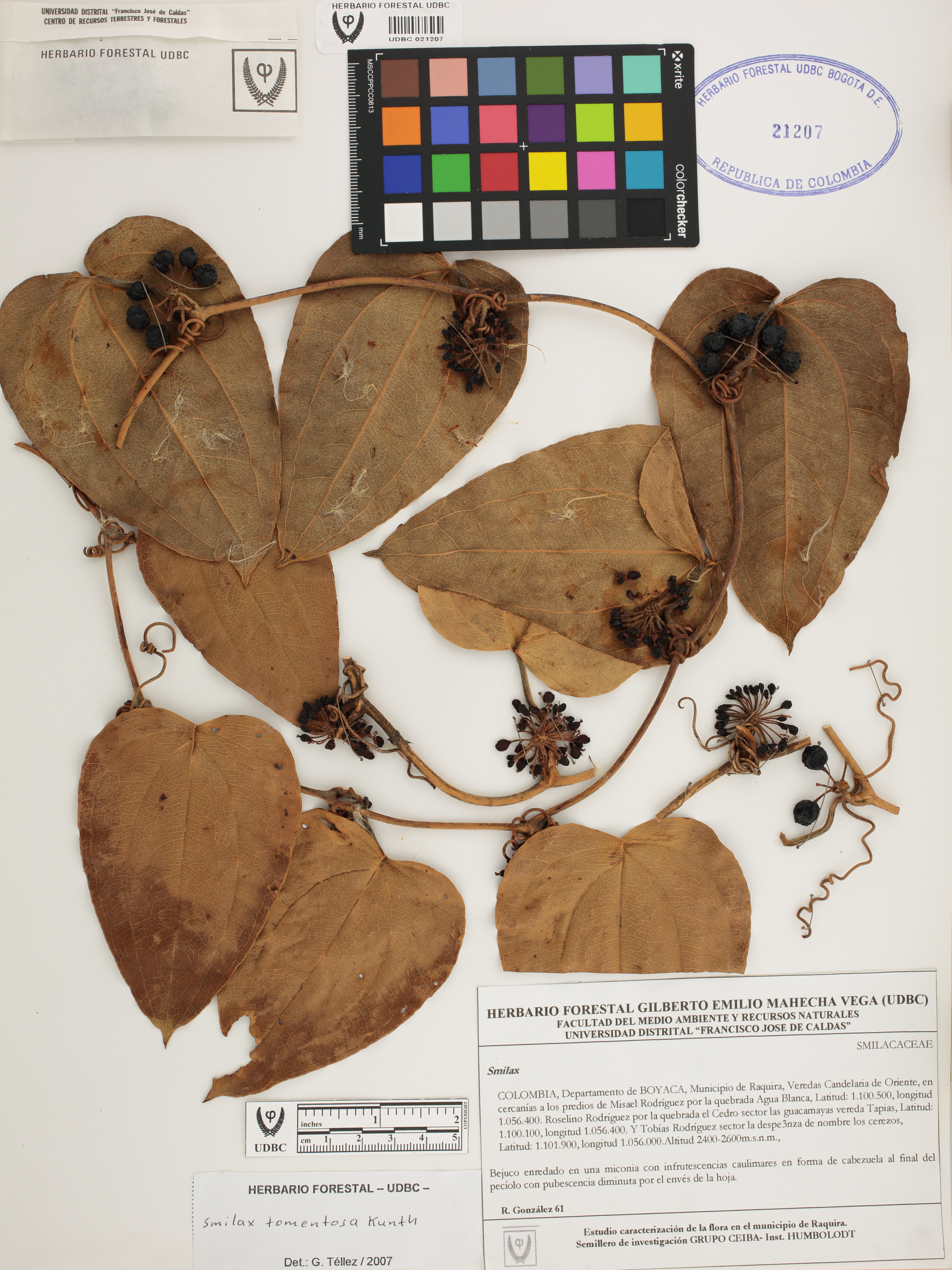 Fotografía del ejemplar González, R. 61, determinado como Smilax tomentosa en el año 2007