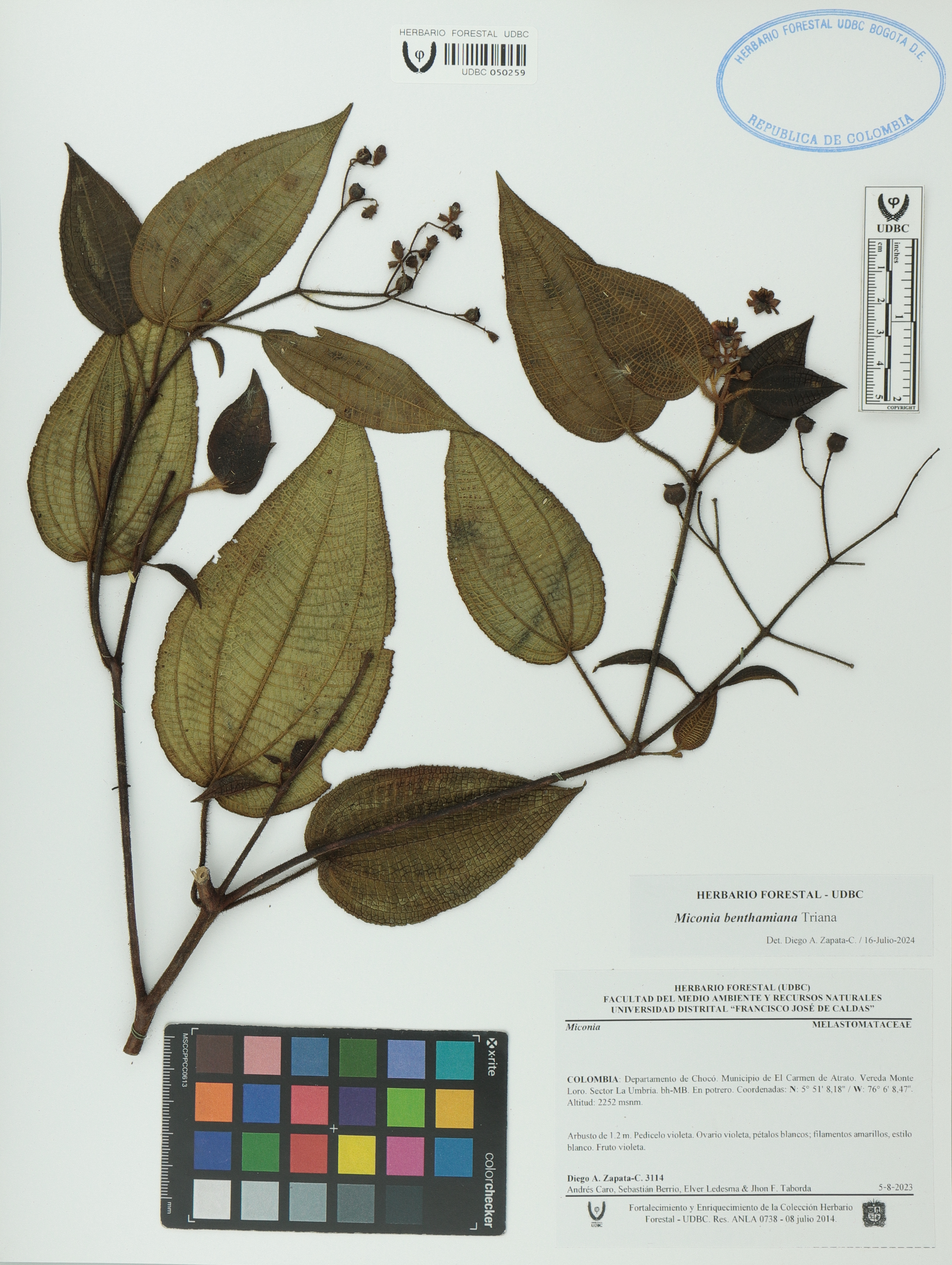 | dc.description | Fotografía del ejemplar Zapata-C., D. 3114, determinado como Miconia benthamiana en el año 2024 | |