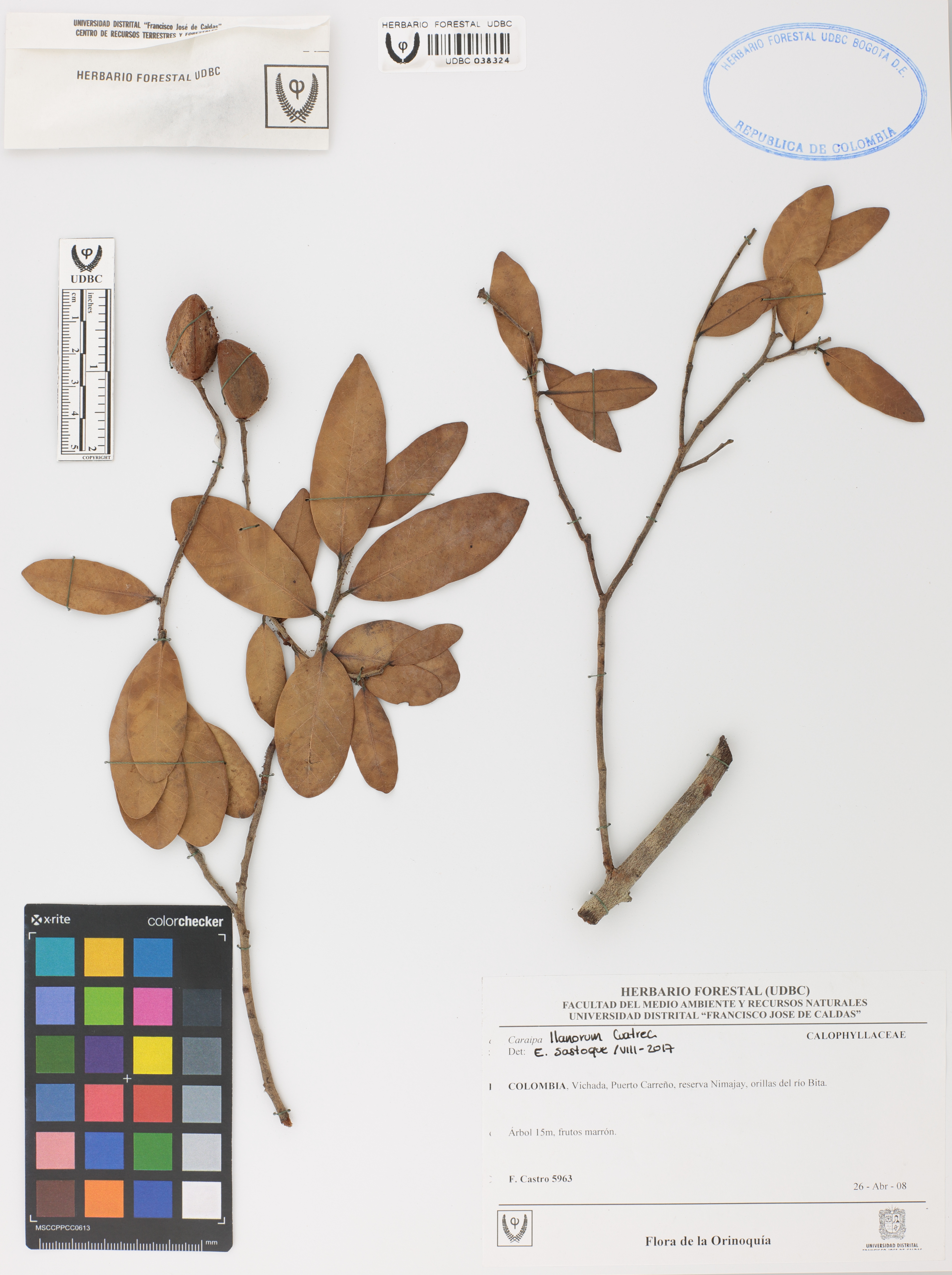 Fotografía del ejemplar Castro, F. 5963, determinado como Caraipa llanorum en el año 2017
