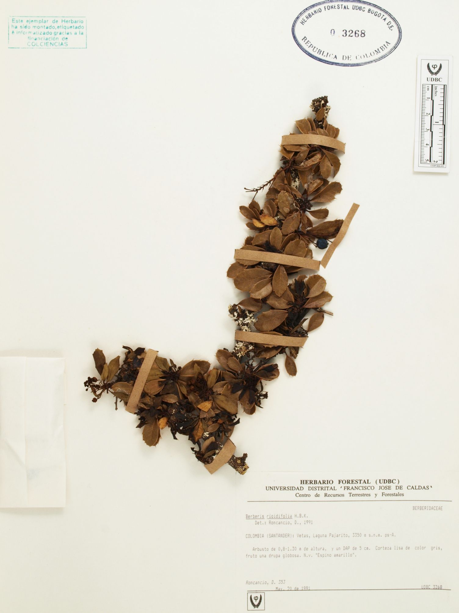 Fotografía del ejemplar Roncancio, D. 353, determinado como Berberis rigidifolia en el año 1991