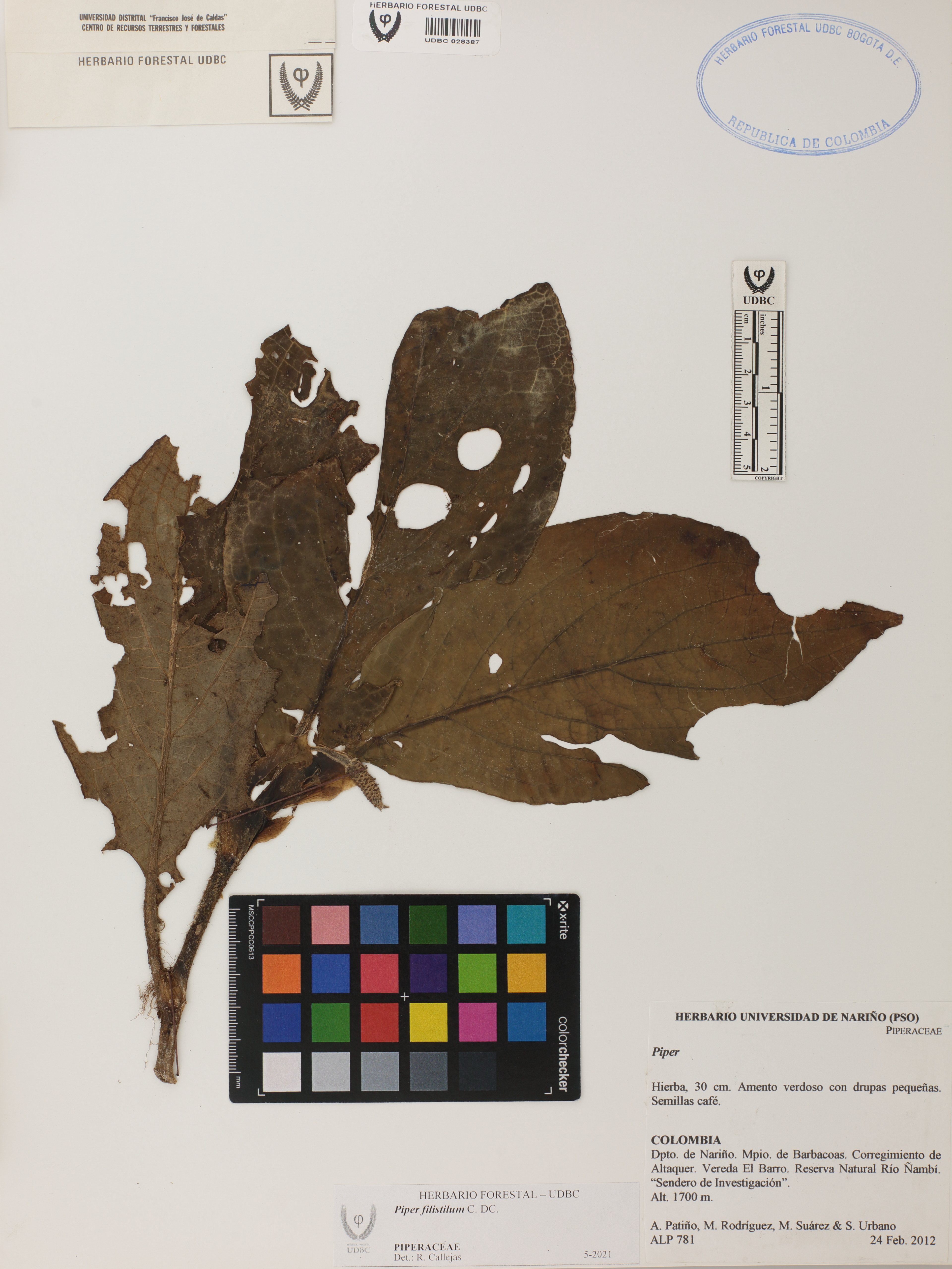 Fotografía del ejemplar Patiño, A. 781, determinado como Piper filistilum en el año 2021