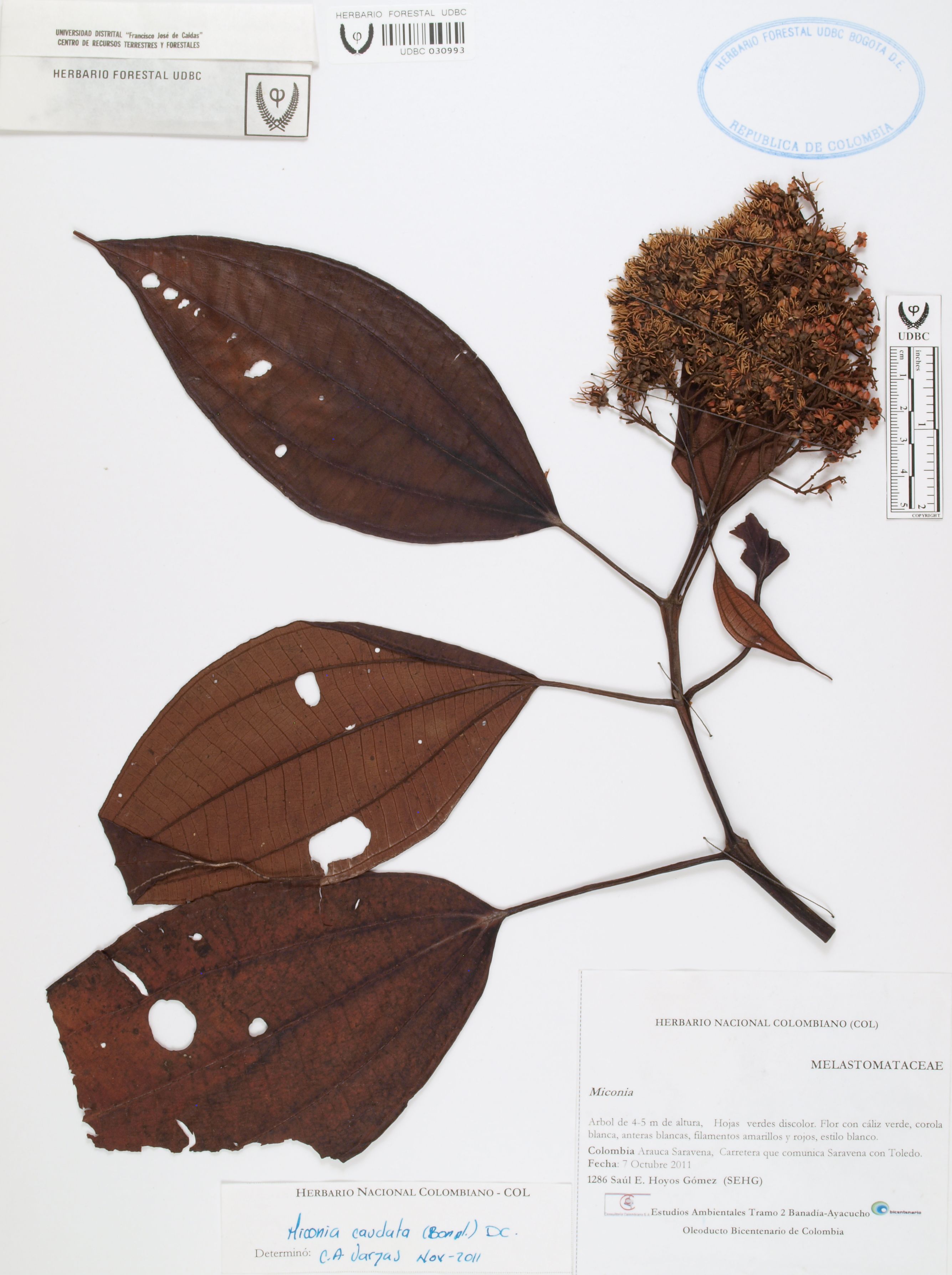 Fotografía del ejemplar Hoyos, S. 1286, determinado como Miconia caudata en el año 2011