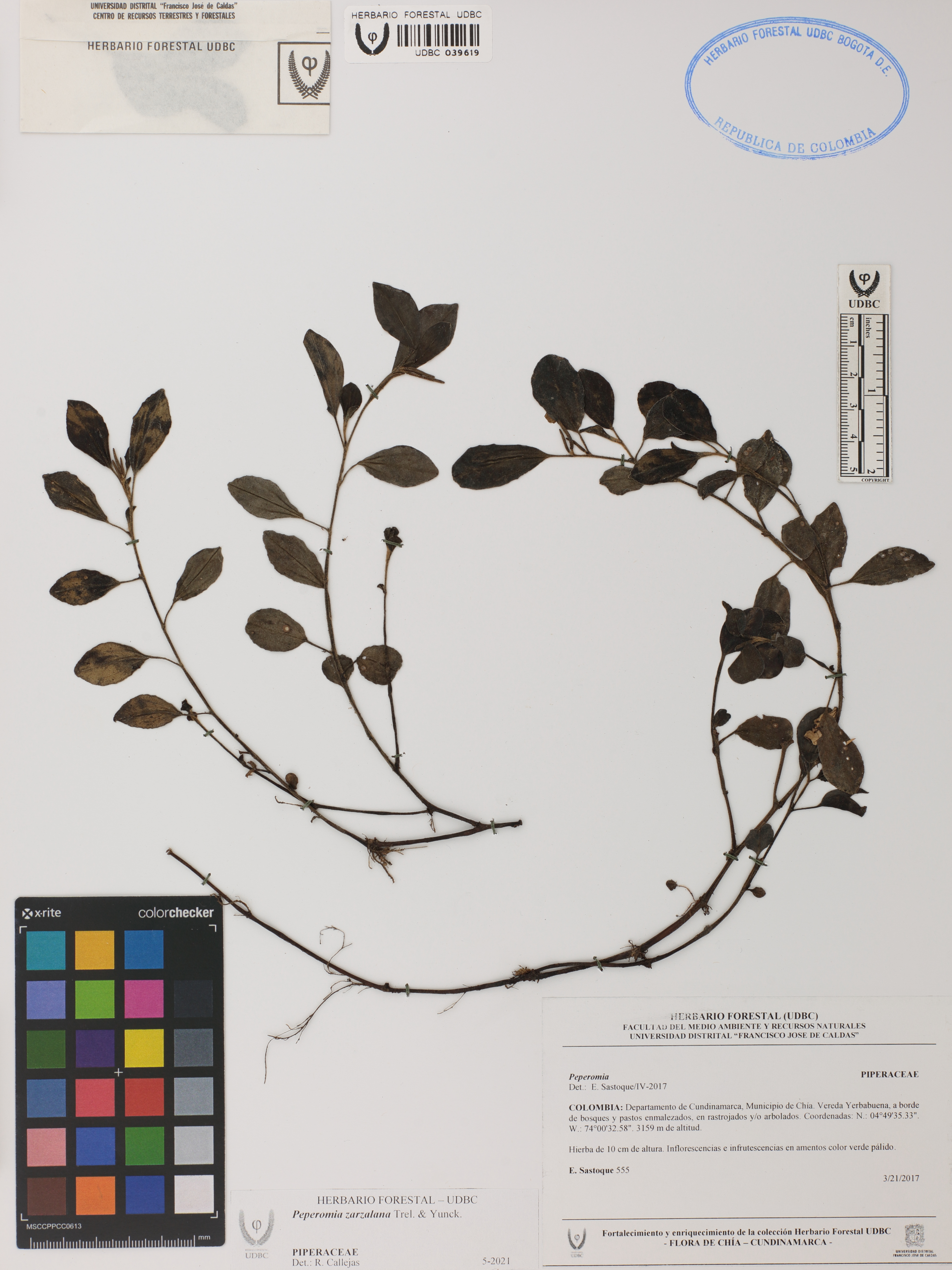 Fotografía del ejemplar Sastoque, E. 555, determinado como Peperomia zarzalana en el año 2021