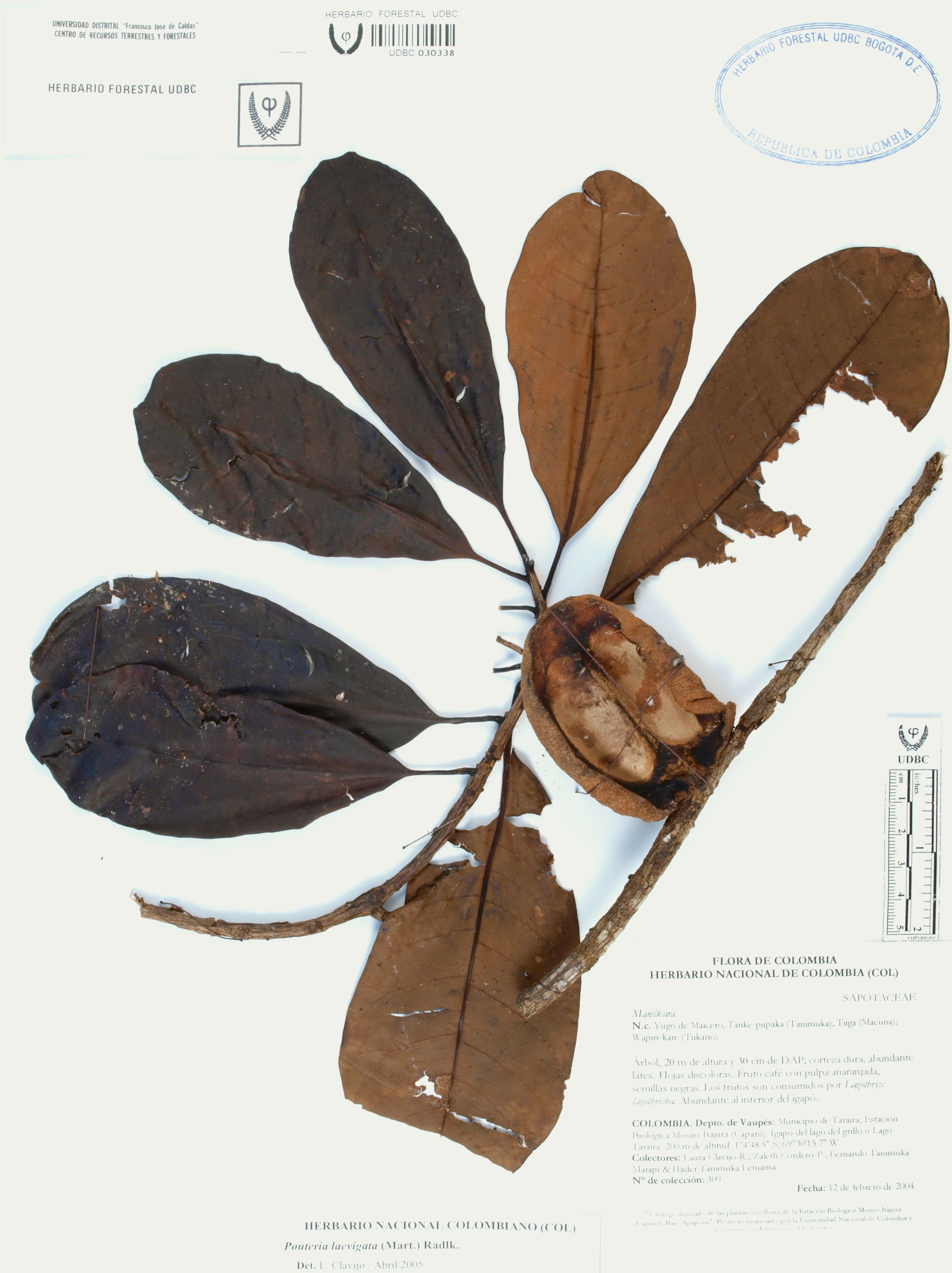 Fotografía del ejemplar Clavijo-R., L. 309, determinado como Pouteria laevigata en el año 2005